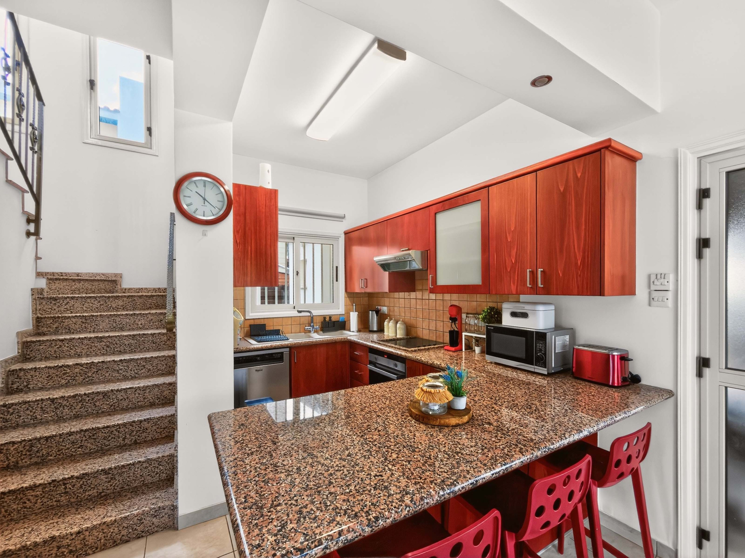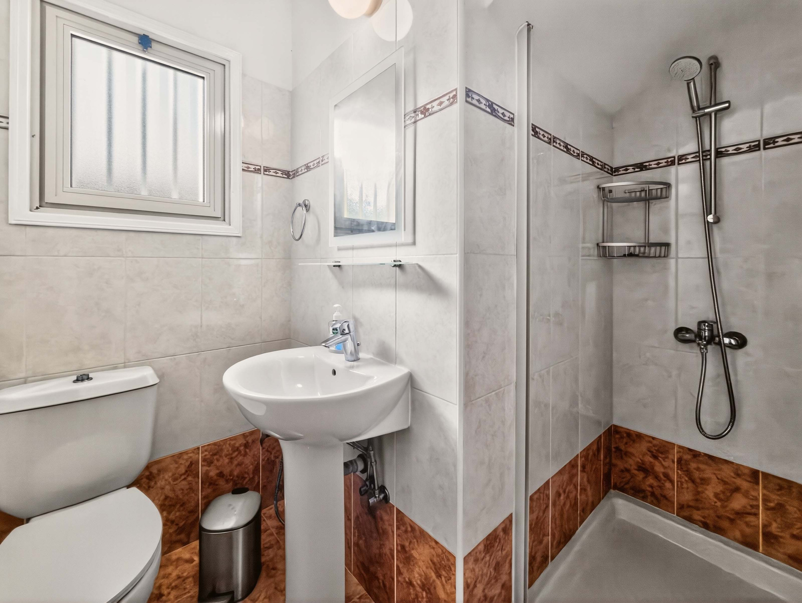 Die Villa verfügt über drei Hauptschlafzimmer auf zwei Etagen. Im Erdgeschoss finden Sie ein Doppelzimmer sowie ein Badezimmer mit Dusche und WC. Im Obergeschoss befinden sich zwei weitere Doppelzimmer und ein Familienbadezimmer, ausgestattet mit einer Badewanne, Dusche und WC. Alle Schlafzimmer sind mit Klimaanlage und Deckenventilator ausgestattet, was das ganze Jahr über Komfort gewährleistet.