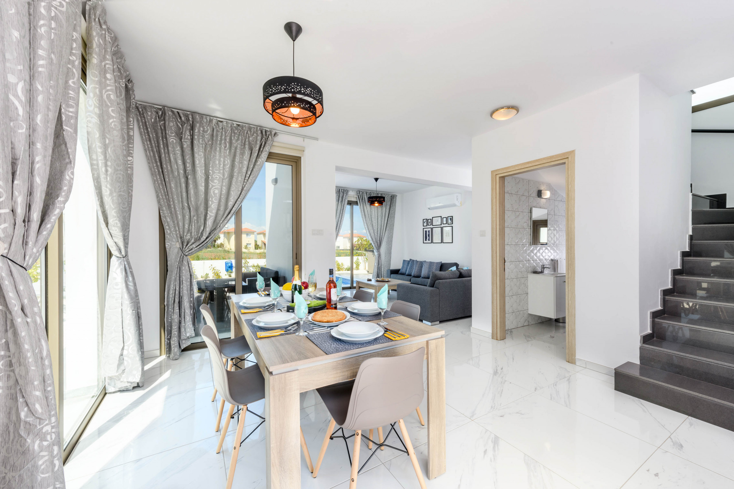 Der Wohnbereich ist offen, lichtdurchflutet und durchdacht eingerichtet mit zwei bequemen Sofas, einem großen Flachbildschirm-TV mit internationalen Sendern, Klimaanlage und WLAN im gesamten Bereich. Der Essbereich bietet bequem Platz für sechs Gäste, während die voll ausgestattete Küche alles bereitstellt, was man für einfache, alltägliche Mahlzeiten während des Aufenthalts benötigt.