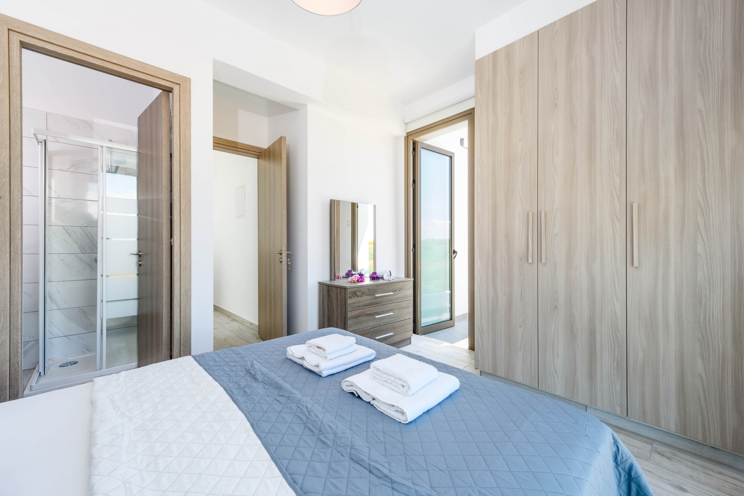 Im Inneren bietet die Villa drei komfortable Schlafzimmer, die sowohl Privatsphäre als auch Bequemlichkeit gewährleisten. Das Hauptschlafzimmer verfügt über ein Doppelbett, ein privates Duschbad und direkten Zugang zu einem eigenen Balkon, perfekt für einen friedlichen Morgenkaffee. Das zweite Doppelzimmer und das Zweibettzimmer teilen sich ein geräumiges Familienbad, wodurch die Raumaufteilung ideal für Familien oder Freundesgruppen ist.