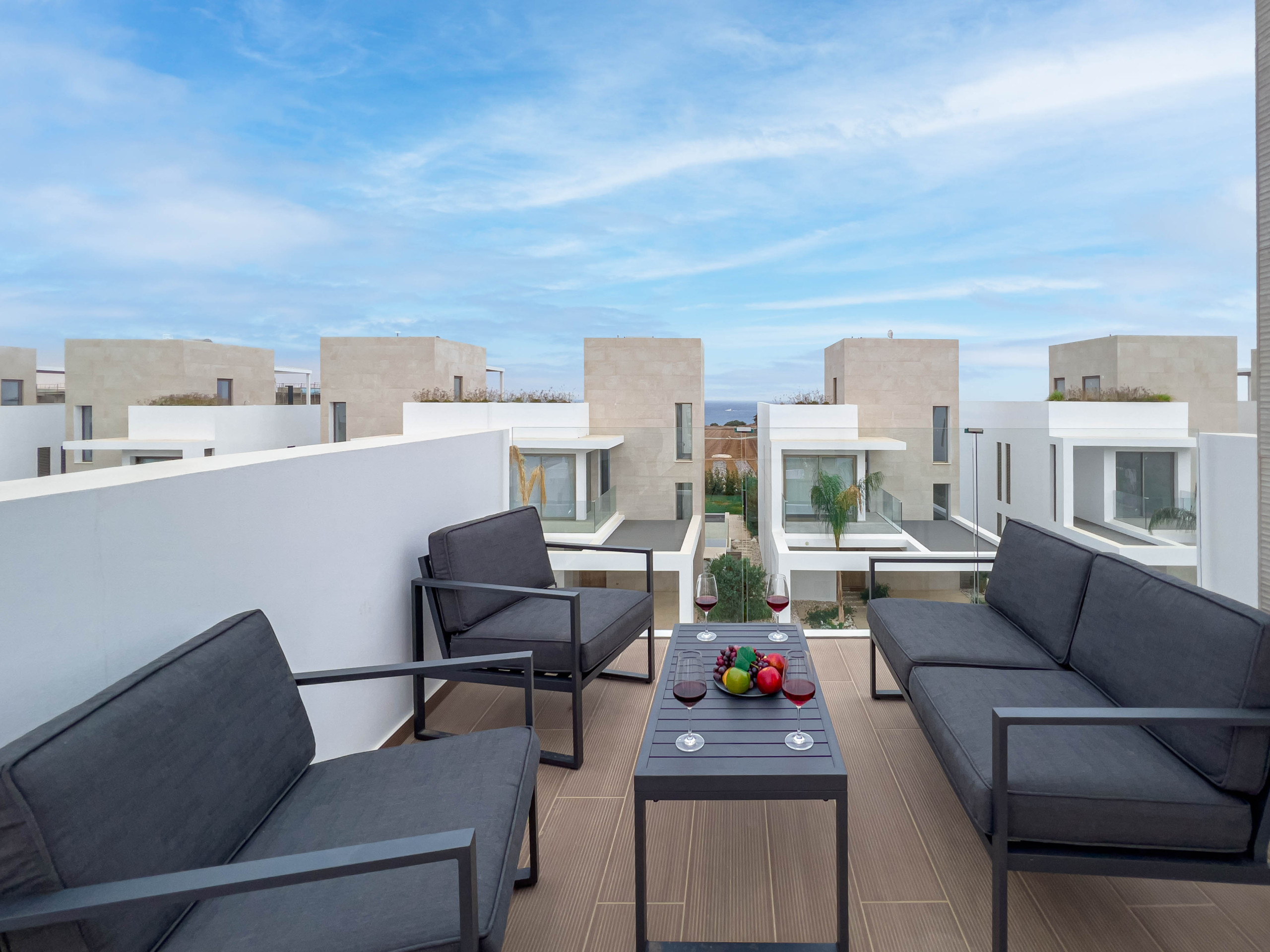 Im Inneren fühlt sich die Villa hell und offen an. Sie ist vollständig klimatisiert und verfügt über einen geräumigen Wohn- und Essbereich, eine moderne Küche mit einer Frühstücksinsel und allen wesentlichen Geräten für einen angenehmen Aufenthalt. Der Wohnbereich umfasst eine Eckcouch, einen Breitbild-Fernseher mit vielen Satellitenkanälen und kostenfreiem WLAN. Große Terrassentüren führen direkt zum Pool. Ein Gäste-WC befindet sich ebenfalls im Erdgeschoss.