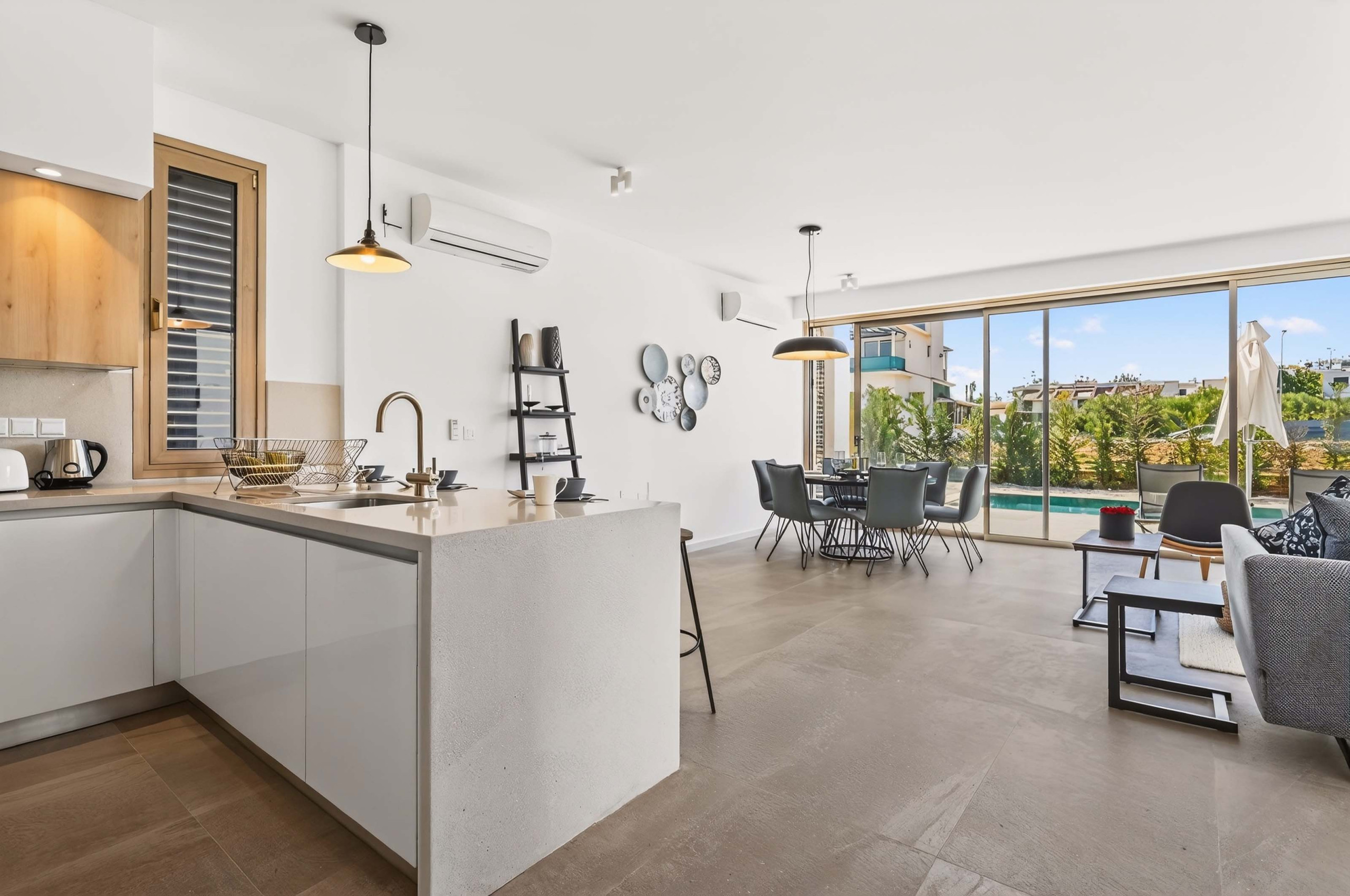 Die Villa beherbergt bequem bis zu sechs Gäste und ist für entspanntes, stressfreies Urlaubsleben konzipiert. Im Inneren finden Sie einen hellen, offenen Wohnbereich mit bequemen Sitzgelegenheiten und einem Flachbild-Fernseher. Die moderne, vollständig ausgestattete Küche verbindet sich nahtlos mit dem Essbereich und macht Selbstverpflegung einfach und angenehm.