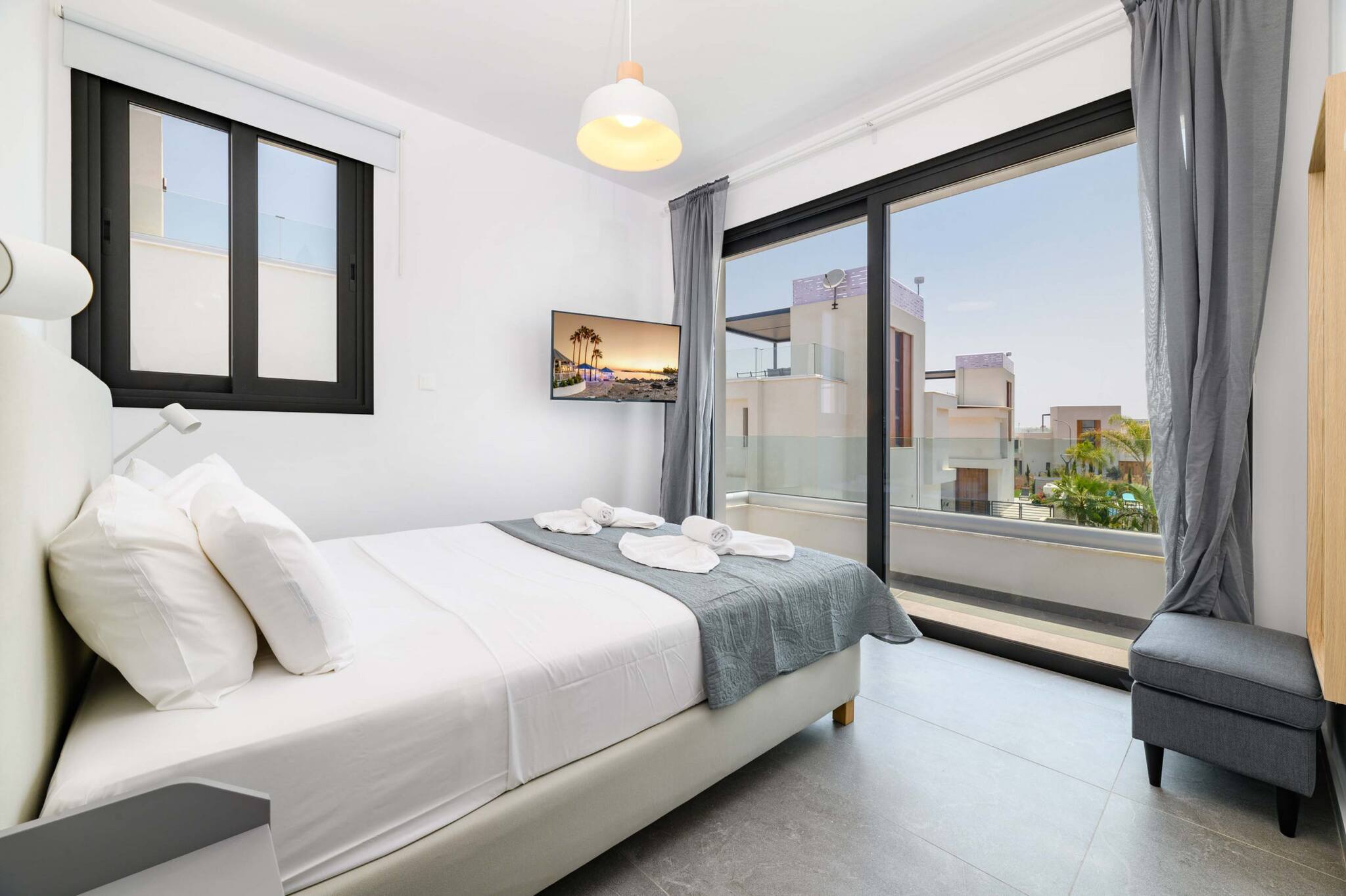 Die Villa verfügt über drei einladende Doppelschlafzimmer und bietet bequem Platz für bis zu sechs Gäste. Es gibt zwei Badezimmer, eines mit Dusche und eines mit Badewanne, was zusätzliche Bequemlichkeit für Familien oder Gruppen bietet. Die voll ausgestattete Küche umfasst moderne Essentials wie eine Spülmaschine, Waschmaschine, Mikrowelle und Hochgeschwindigkeits-Glasfaserinternet, was einen reibungslosen und stressfreien Aufenthalt gewährleistet.
