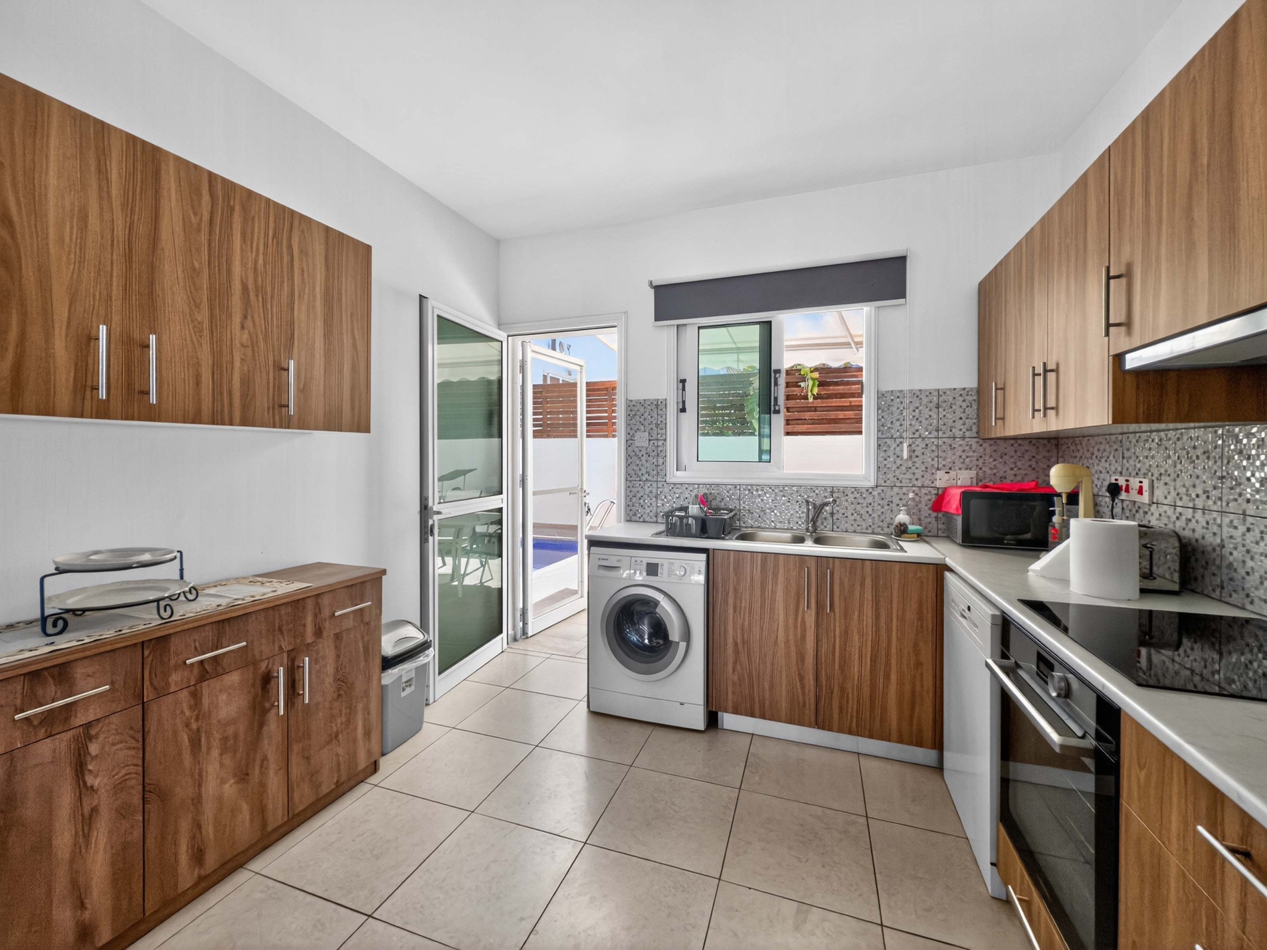 Hell, luftig und durchdacht angelegt, erstreckt sich der Wohn- und Essbereich bis zu einer schattigen Terrasse mit Blick auf den privaten Swimmingpool. Im Freien finden Sie einen überdachten Essbereich mit Sitzplätzen für sechs sowie einen entspannenden Loungebereich, ideal für gemütliche Frühstücke, lange Mittagessen und friedliche Abende in der zyprischen Sonne.