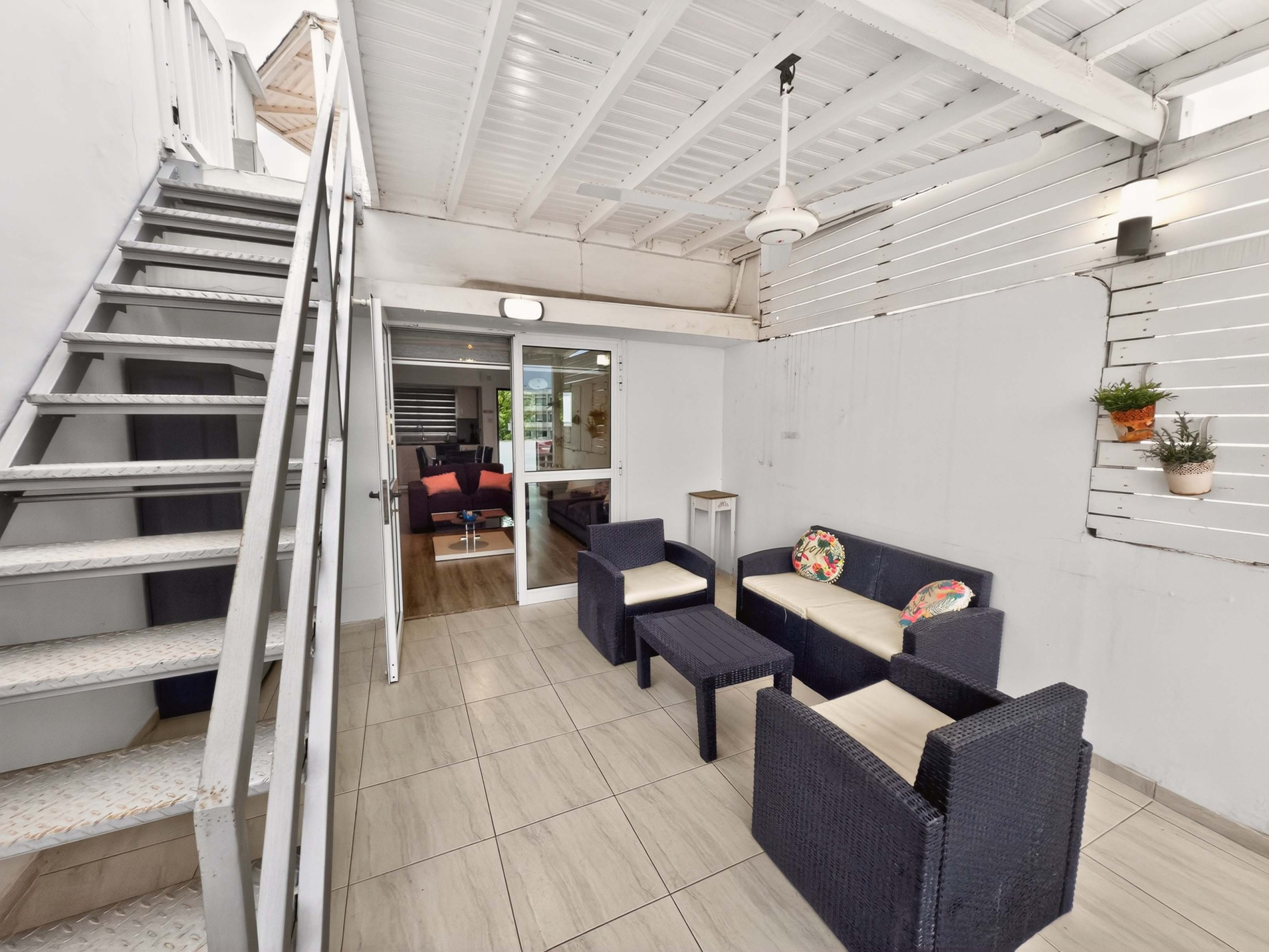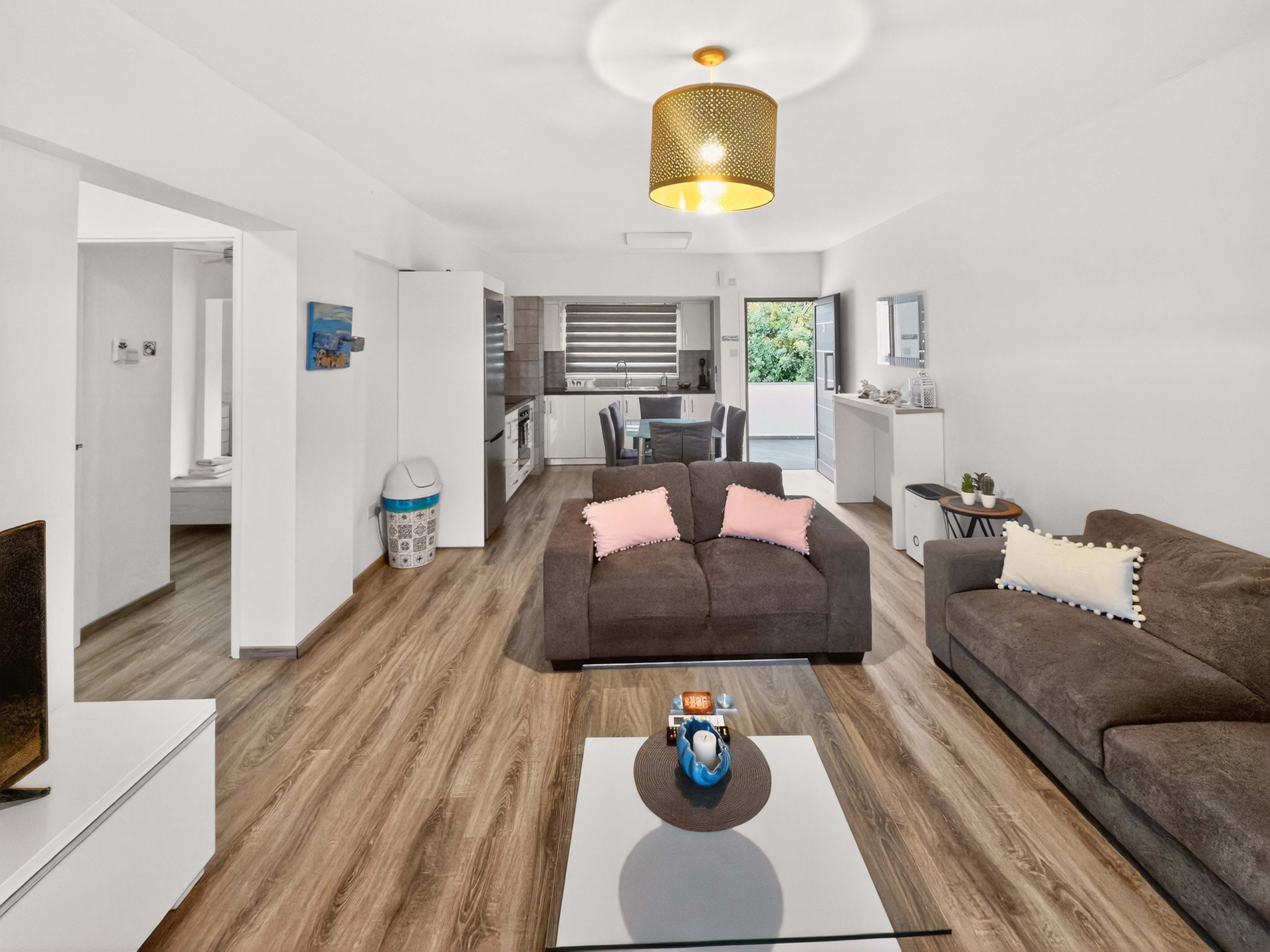 À l'intérieur, l'appartement est lumineux, spacieux et aménagé avec soin pour un séjour de vacances sans effort. La cuisine et le salon en plan ouvert créent un cadre détendu pour se réunir, que ce soit pour préparer un petit-déjeuner léger avant la plage ou profiter d'une soirée tranquille à l'intérieur. Des meubles confortables et un téléviseur à écran plat complètent l'espace de vie accueillant.