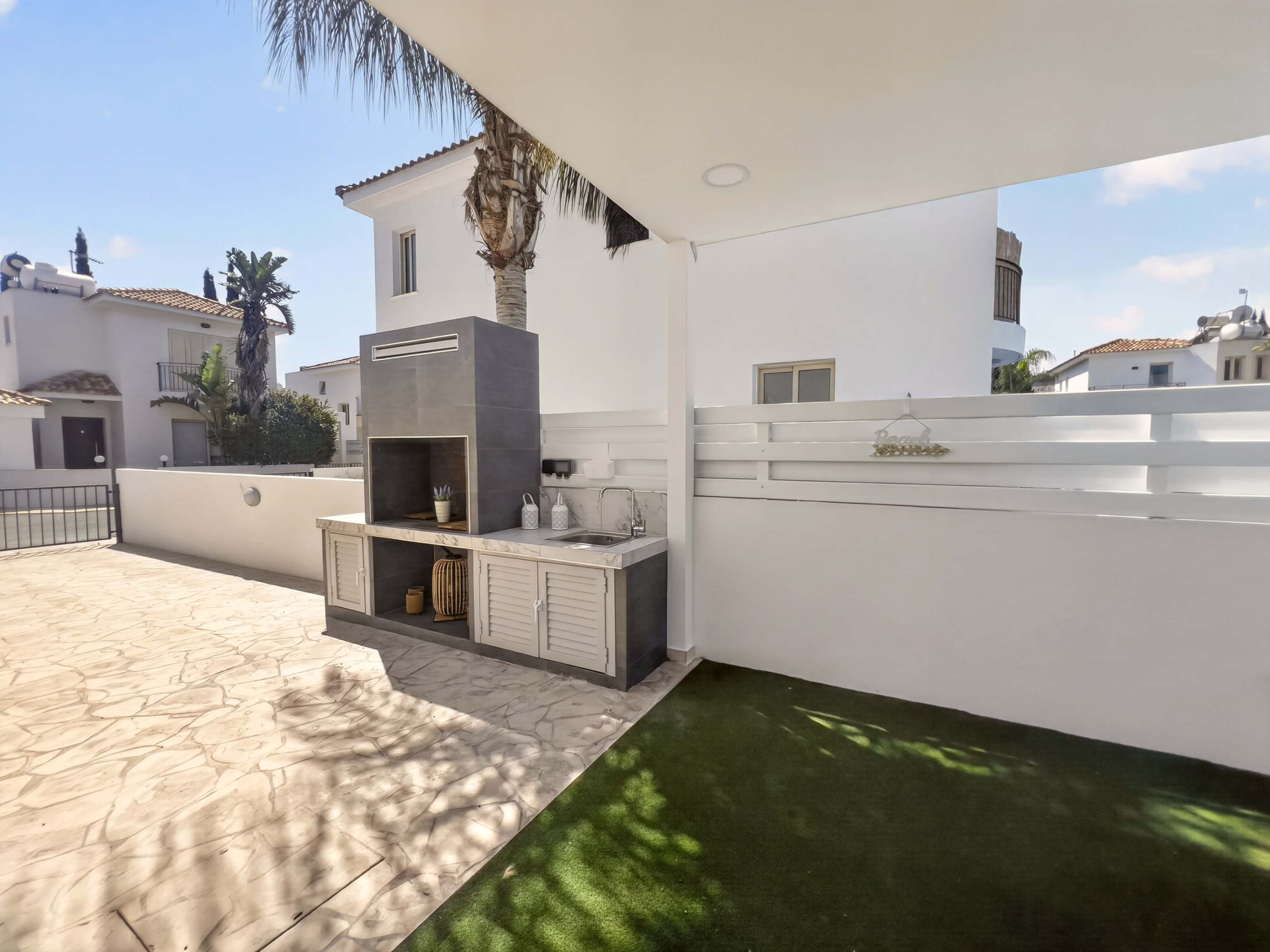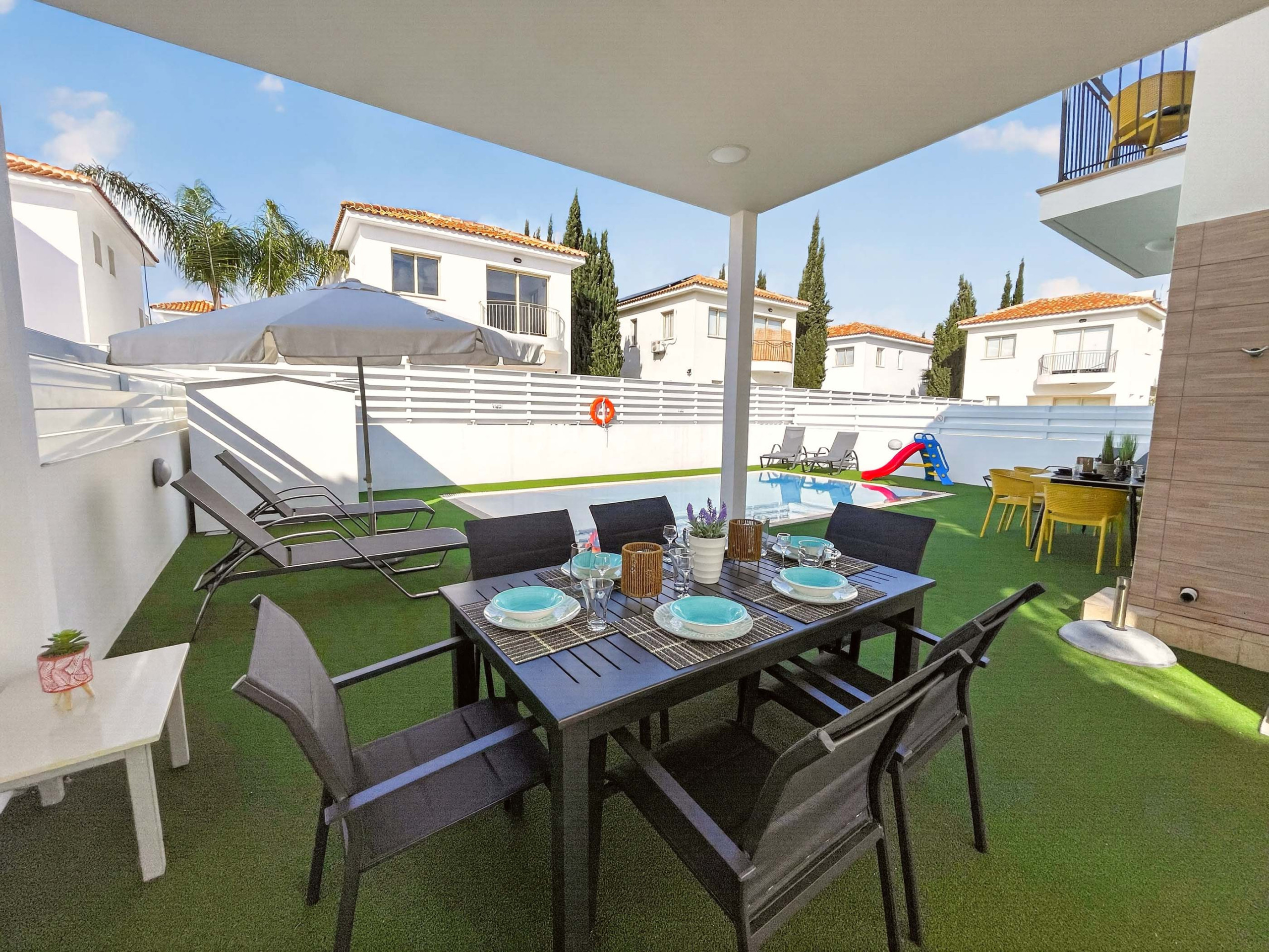 Villa à Protaras qui possède 3 chambre(s) et Capacité pour 6 personnes. Logement de 180 m². Elle dispose de jardin, mobilier de jardin, lave-linge, barbecue, fer à repasser, accès internet (wifi), sèche-cheveux, balcon, zone pour les enfants, climatisation dans tout le logement, piscine privée, parking extérieur même bâtiment, 1 Télévision, tv satellite (Langues: Espagnol, Anglais, Allemand, Hollandais, Français, Russe, Suédois, Norvégien).La cuisine américaine, Électrique, est équipée avec réfrigérateur, micro-ondes, four, vaisselle/couverts, ustensiles/cuisine, cafetière, bouilloire et cuisinière.