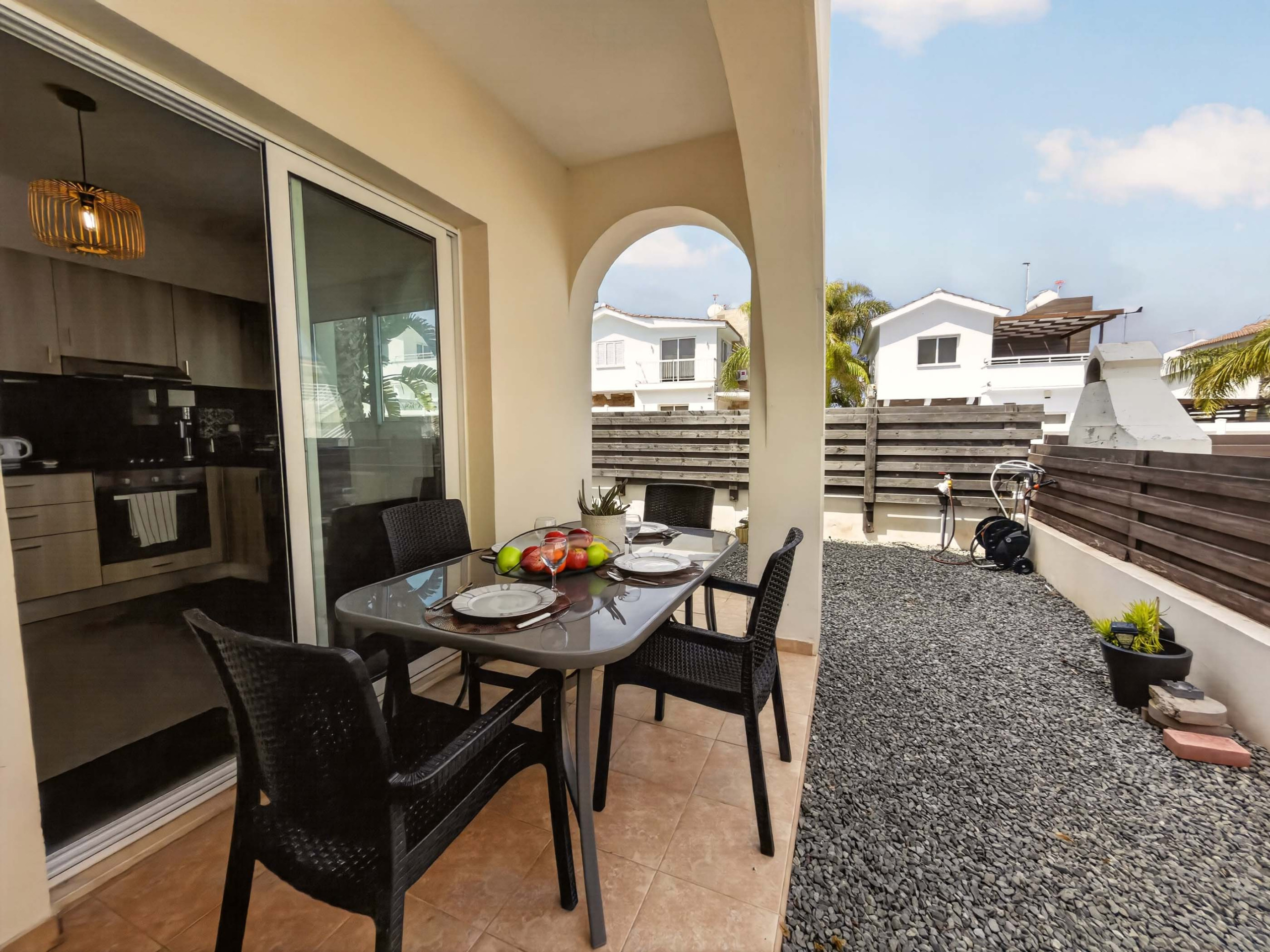 All'interno, troverai un'area living luminosa con luce naturale, una cucina completamente attrezzata per il self catering e uno spazio pranzo che si apre su un patio privato. L'area esterna è perfetta per il caffè mattutino o pasti serali informali.