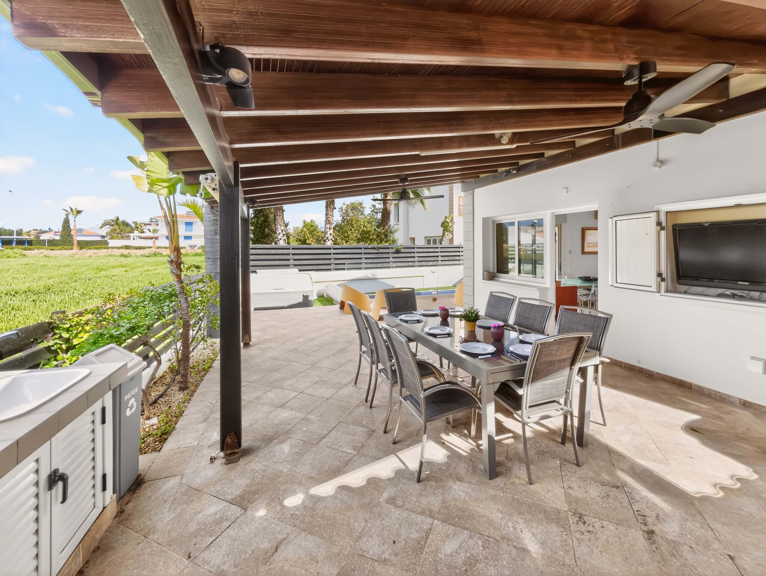 Utenfor kan gjester nyte en privat svømmebasseng omgitt av solsenger, som skaper det perfekte stedet å slappe av under den cypriotiske solen. Villaen har også en jacuzzi som kan klargjøres for gjester på forespørsel mot et lite tilleggsgebyr.