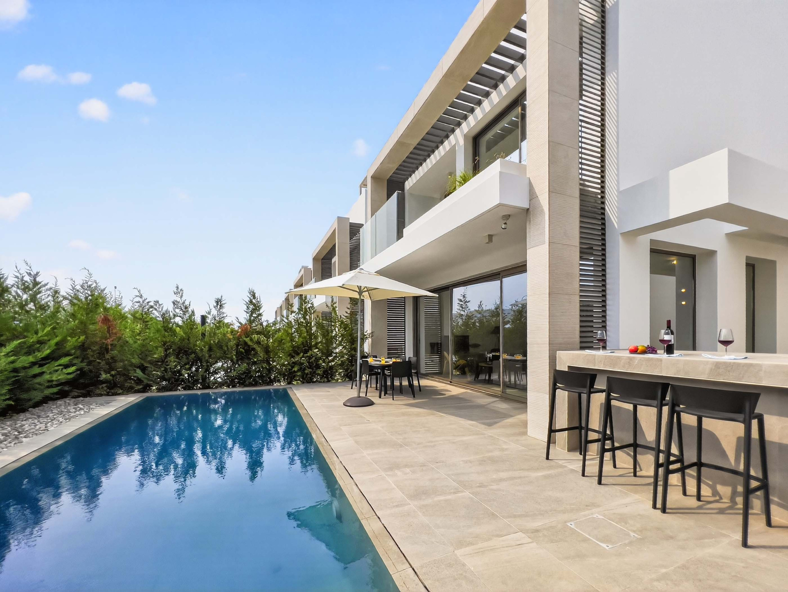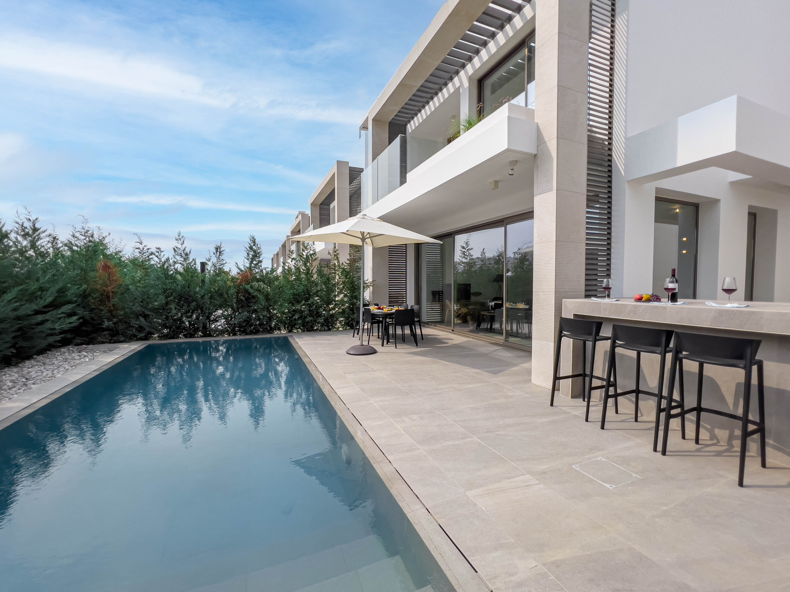 Den tre soverom layouten inkluderer en privat pool, romslig utendørsareal, solsenger, en grill og behagelige utendørs sitteplasser. Det er en ideell setting for avslappende dager hjemme.