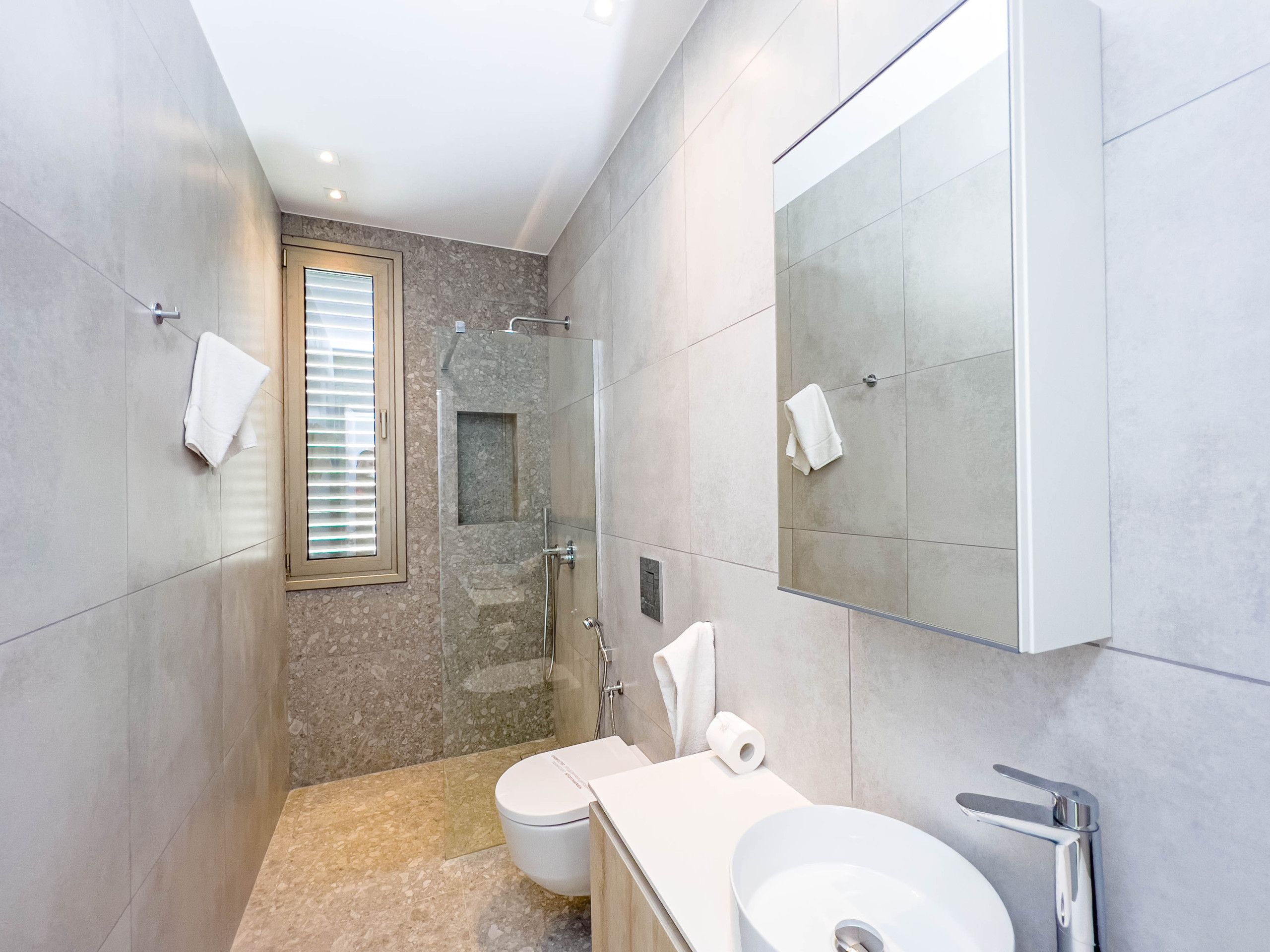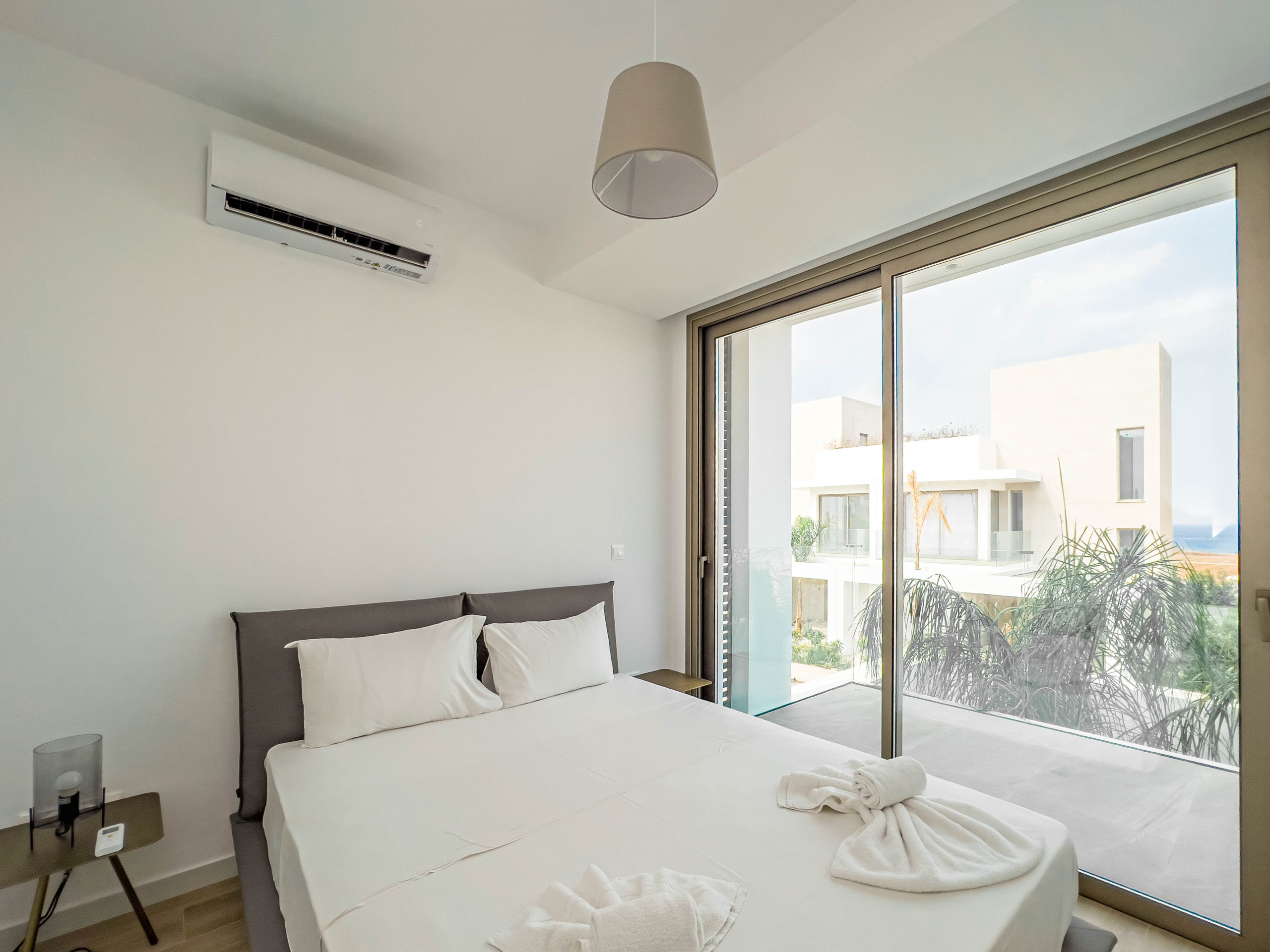 Oppe er det tre komfortable soverom. Hovedsoverommet har eget bad. Det andre soverommet har to enkeltsenger, og det tredje inneholder én enkeltseng og en dobbeltsovesofa. Hvert rom inkluderer garderobeskap og blackout-gardiner. Alle soverom har tilgang til en felles balkong som ser utover den private svømmebassenget. Et familiebad betjener denne etasjen.