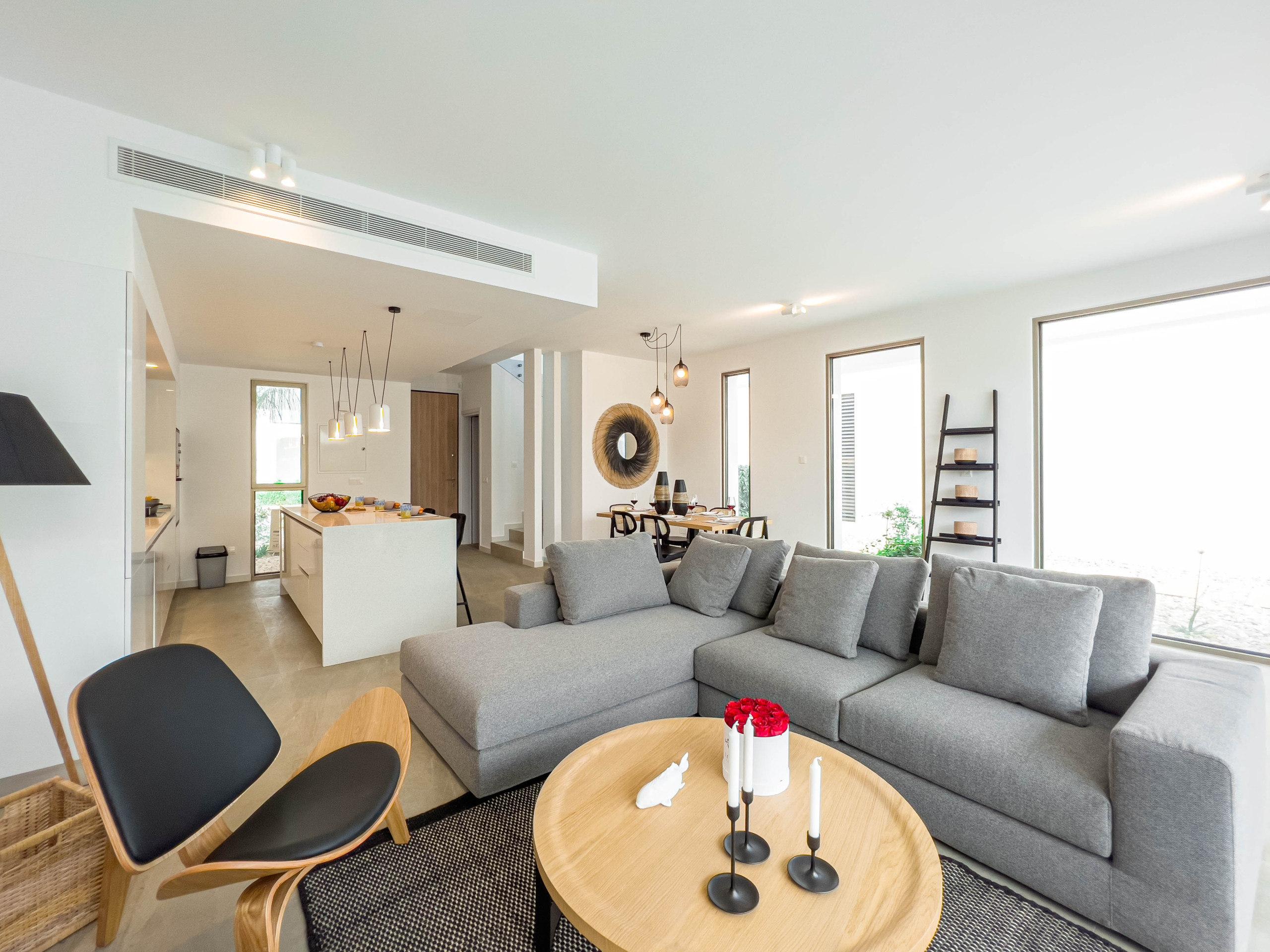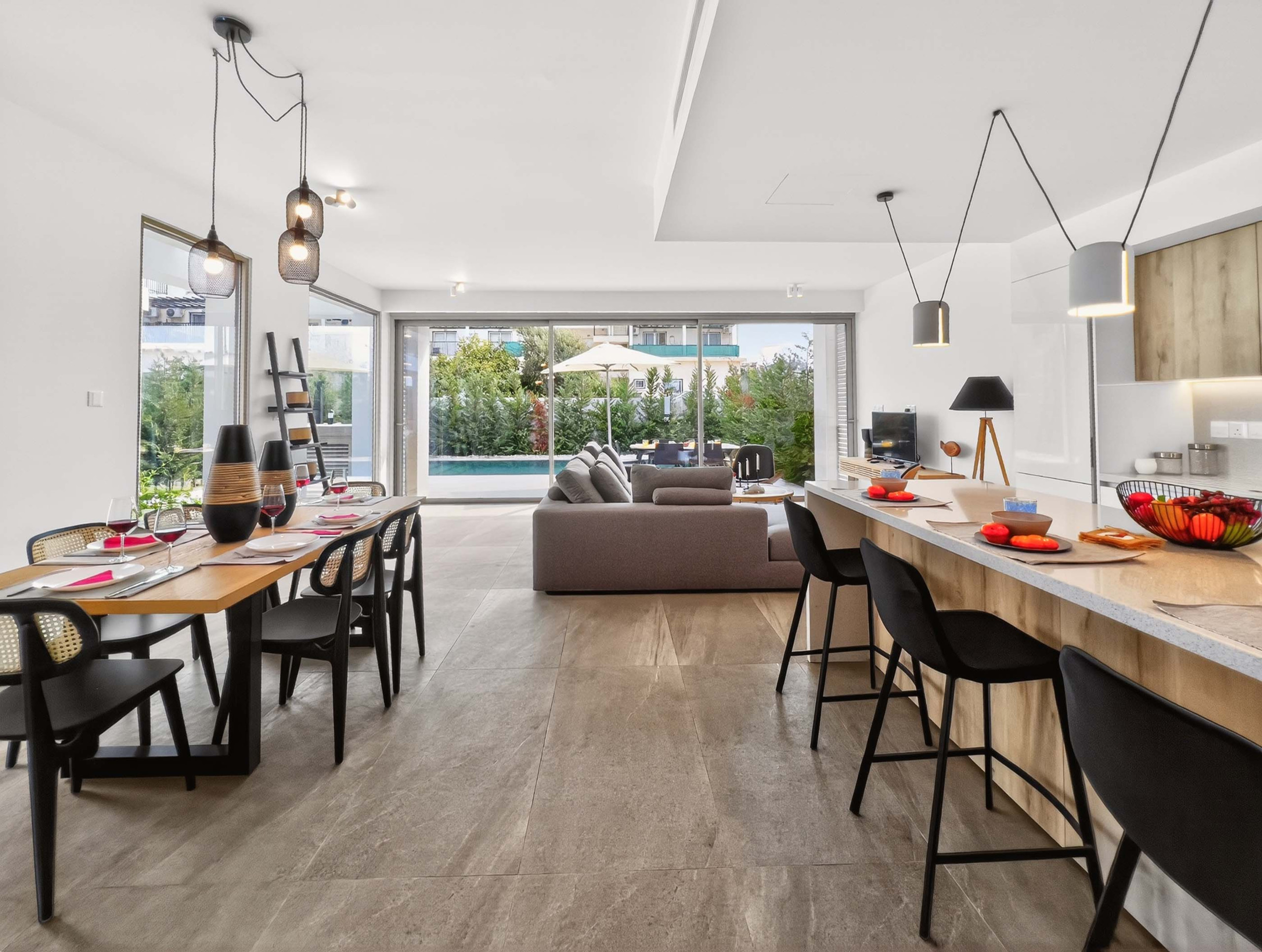 Innvendig føles villaen lys og åpen. Den er fullt klimatisert og har en romslig stue- og spisestue, et moderne kjøkken med en frokostøy, og alle nødvendige apparater for et behagelig opphold. Oppholdsrommet inkluderer en hjørnesofa, en widescreen-TV med mange satellittkanaler, og gratis WiFi. Store terrassedører leder rett ut til bassenget. Et gjeste-WC er også på bakkeplan.