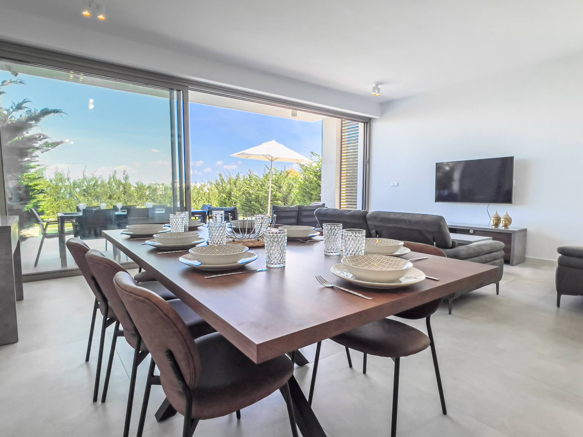 Innvendig byr villaen på en lys, åpen stue som naturlig flyter over i spiseplassen og det fullt utstyrte kjøkkenet. Interiørene er moderne, luftige og designet for enkel feriebolig, med god plass til å slappe av, sosialisere og koble av.