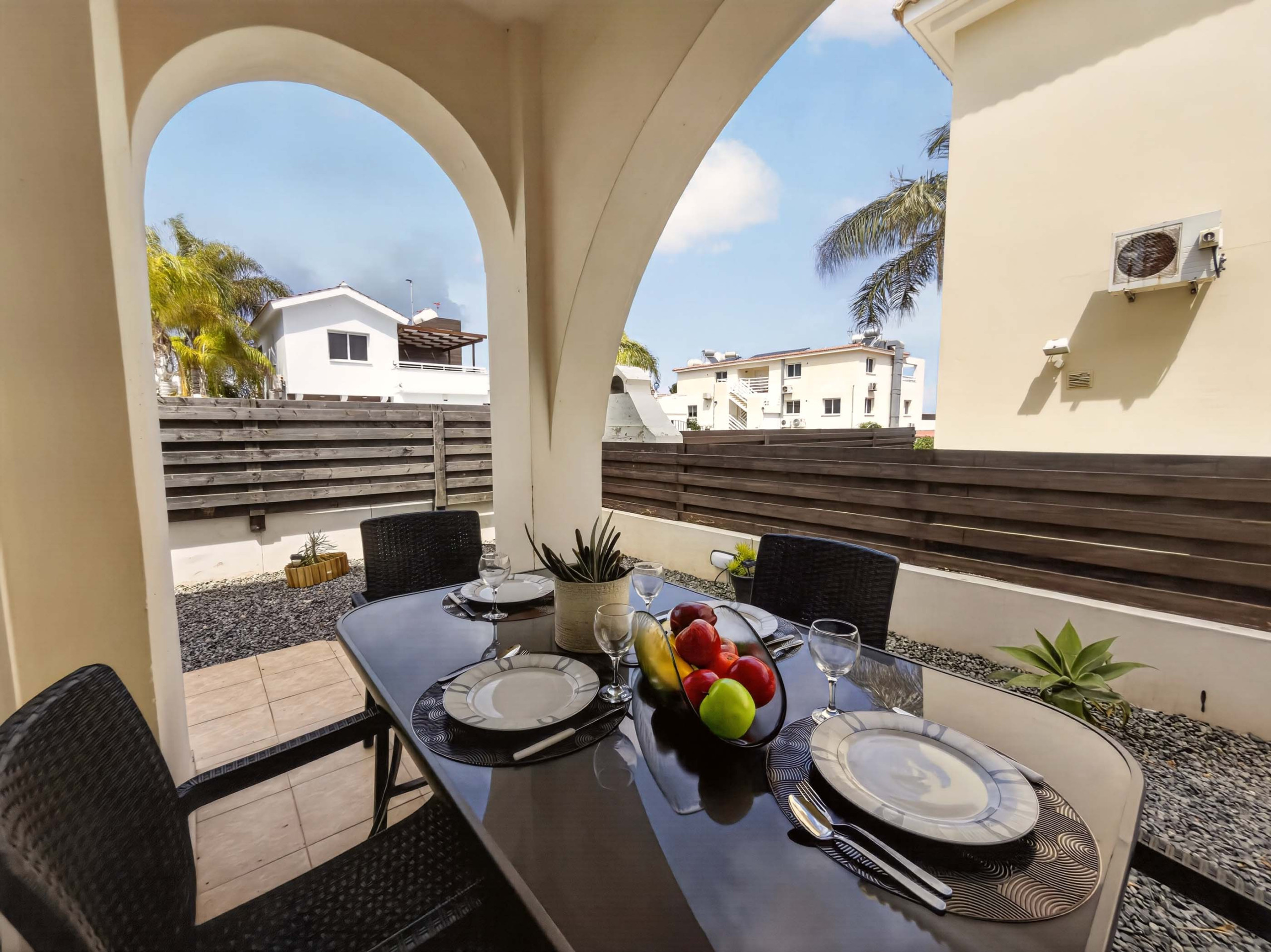 Utenfor tilbyr villaen et deilig spiseområde som er perfekt for frokoster, avslappede lunsjmåltider eller kveldsmåltider under åpen himmel. Det er også et privat område ved siden av villaen for solbading, som gir gjestene et rolig sted å slappe av og nyte Kypros-solen i komfort.