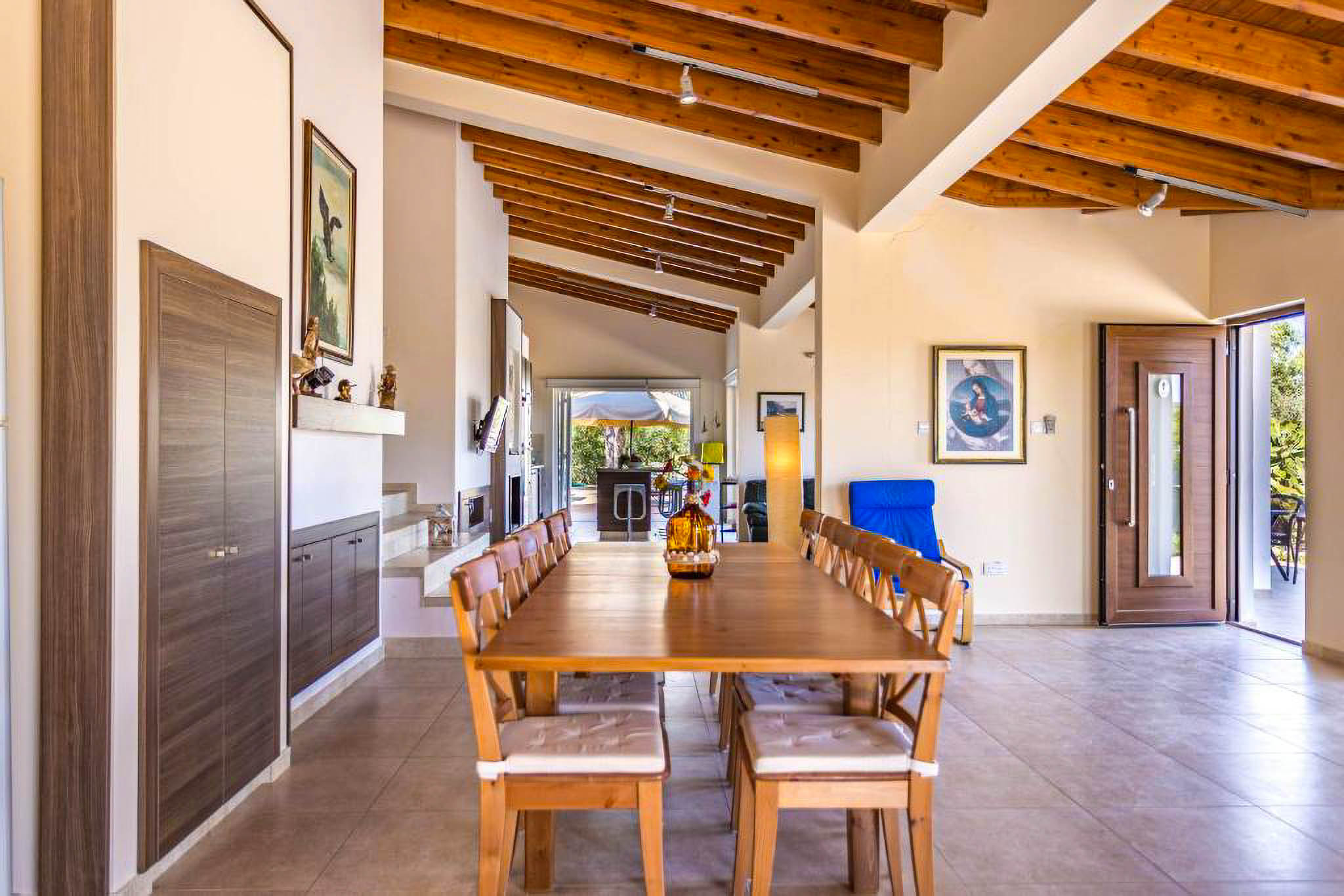 Jasny, przestronny i przemyślany, salon i jadalnia rozciągają się na zacieniony taras z widokiem na prywatny basen. Na zewnątrz znajdziesz zadaszony obszar jadalny z miejscami siedzącymi dla sześciu osób, wraz z relaksacyjną przestrzenią wypoczynkową, idealną na powolne śniadania, długie obiady i spokojne wieczory na cypryjskim słońcu.