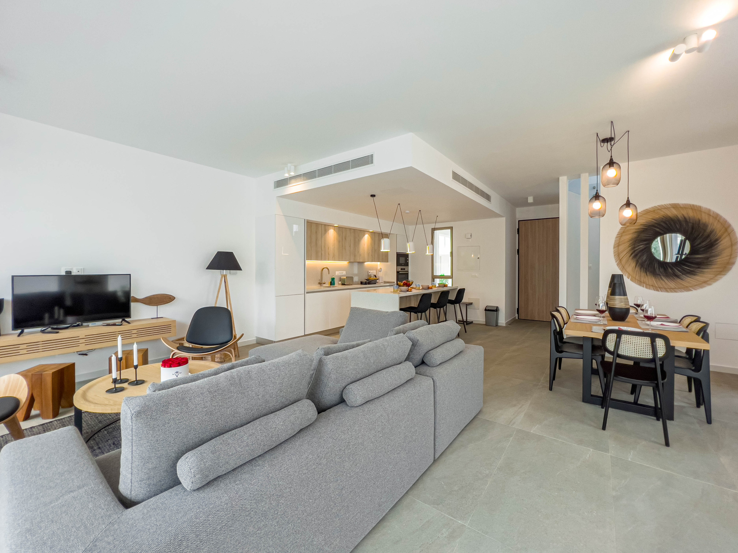 Inside, the villa feels bright and open. It is fully air conditioned and features a spacious living and dining area, a modern kitchen with a breakfast island, and all essential appliances for an enjoyable stay. The living space includes a corner sofa, a widescreen TV with many satellite channels, and free WiFi. Large patio doors lead straight to the pool. A guest WC is also on the ground level.