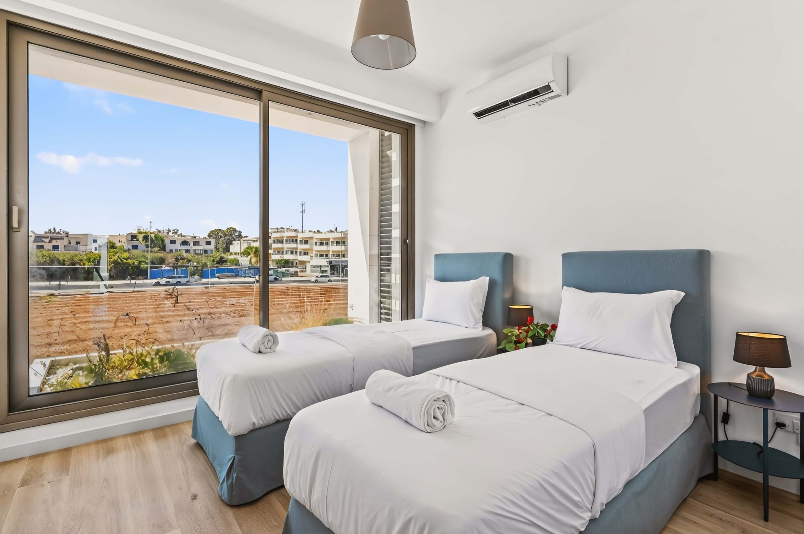 The master bedroom features a double bed and an ensuite bathroom. The second and third bedrooms are tastefully furnished and ideal for children or additional guests. Large windows allow natural light to fill the spaces, while the partial sea view adds a pleasant Mediterranean touch to your stay.