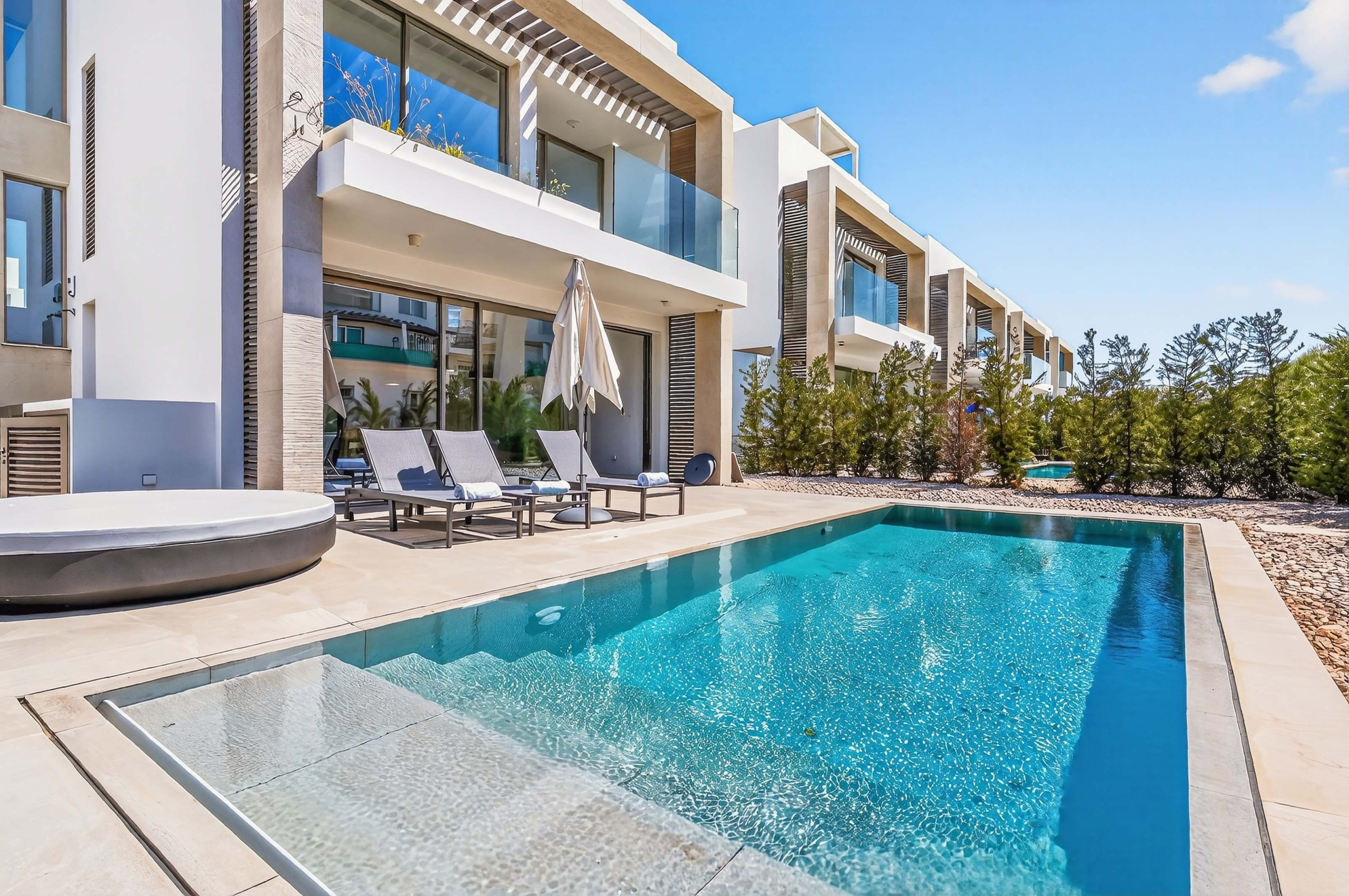 Azure Sama Villa is a modern three bedroom villa located in the peaceful area of Kapparis, just a short walk from sandy beaches and within easy reach of restaurants, bakeries, cafes and local pubs. Situated in the same well maintained complex and enjoying partial sea views, the villa offers a calm coastal setting with comfort and privacy. It is proudly managed by ElloCyprus, ensuring attentive local support throughout your stay.