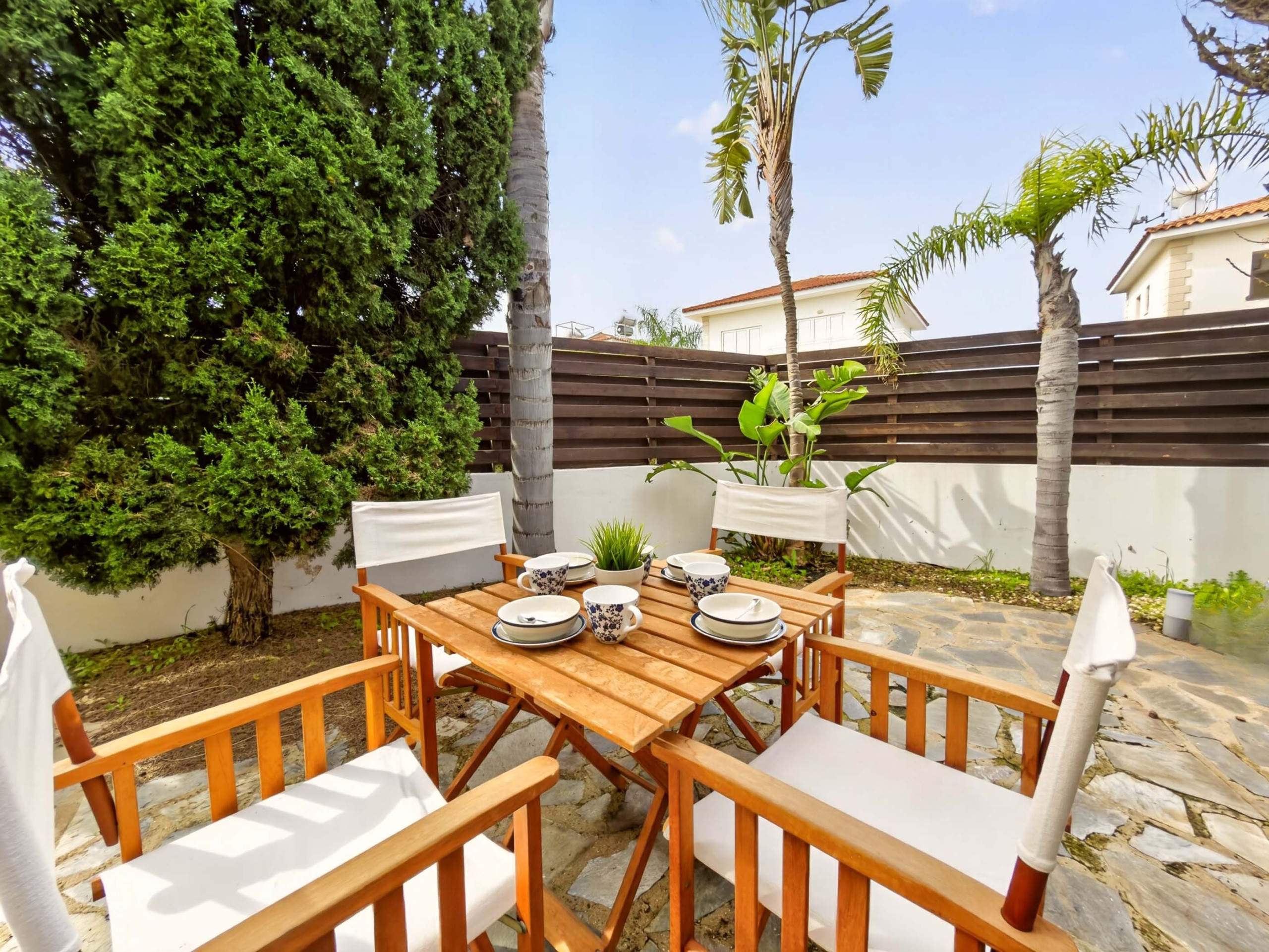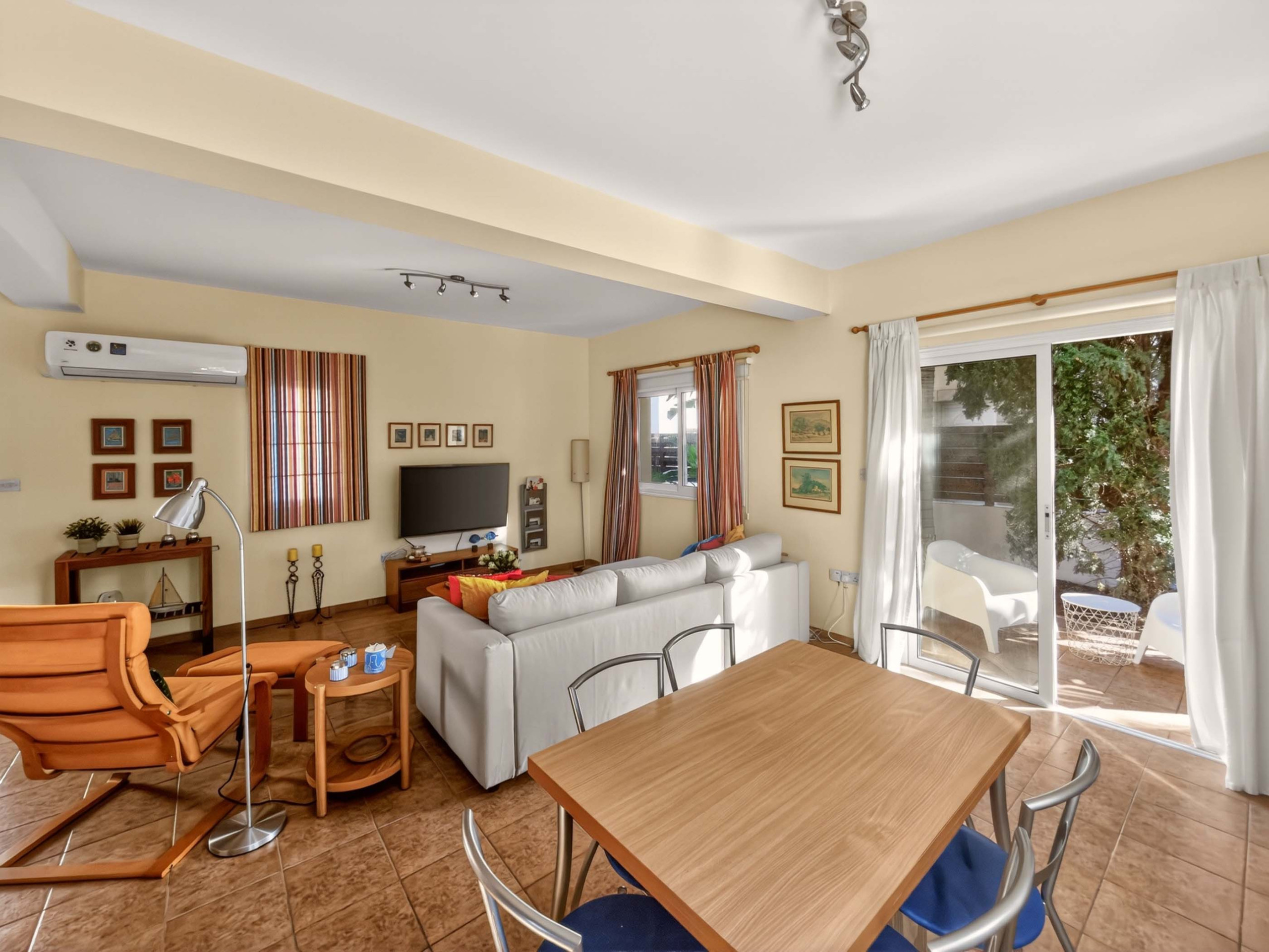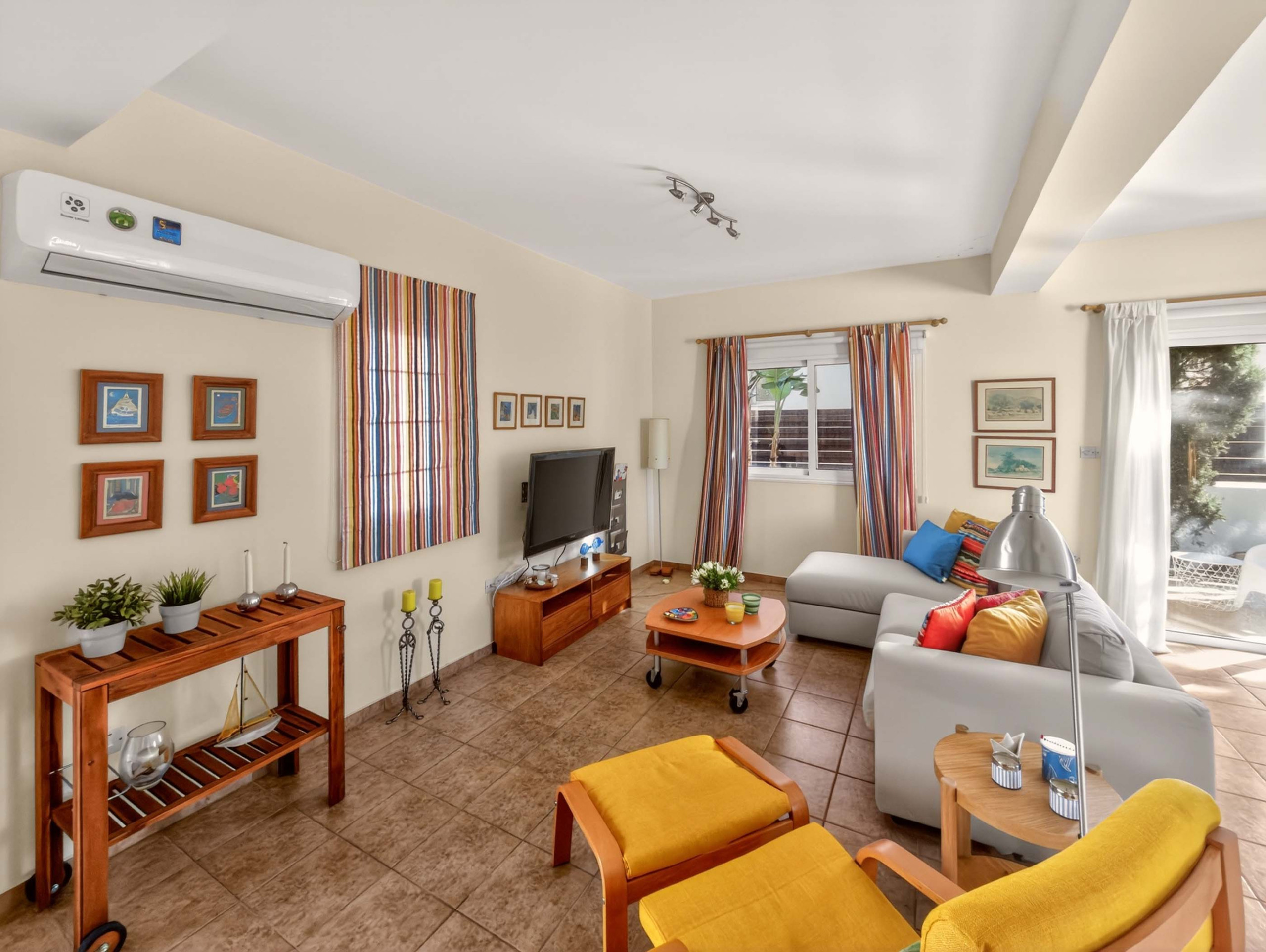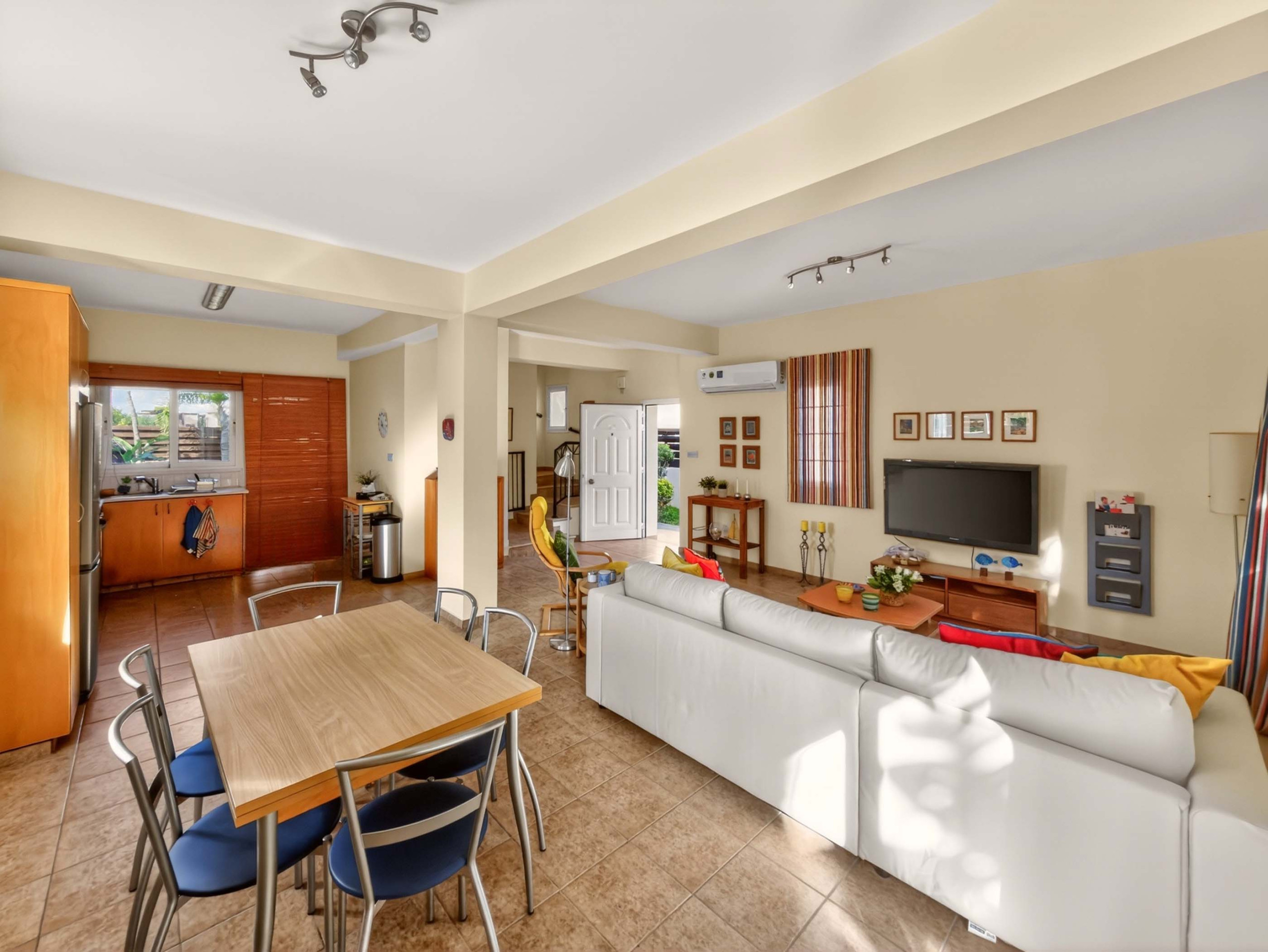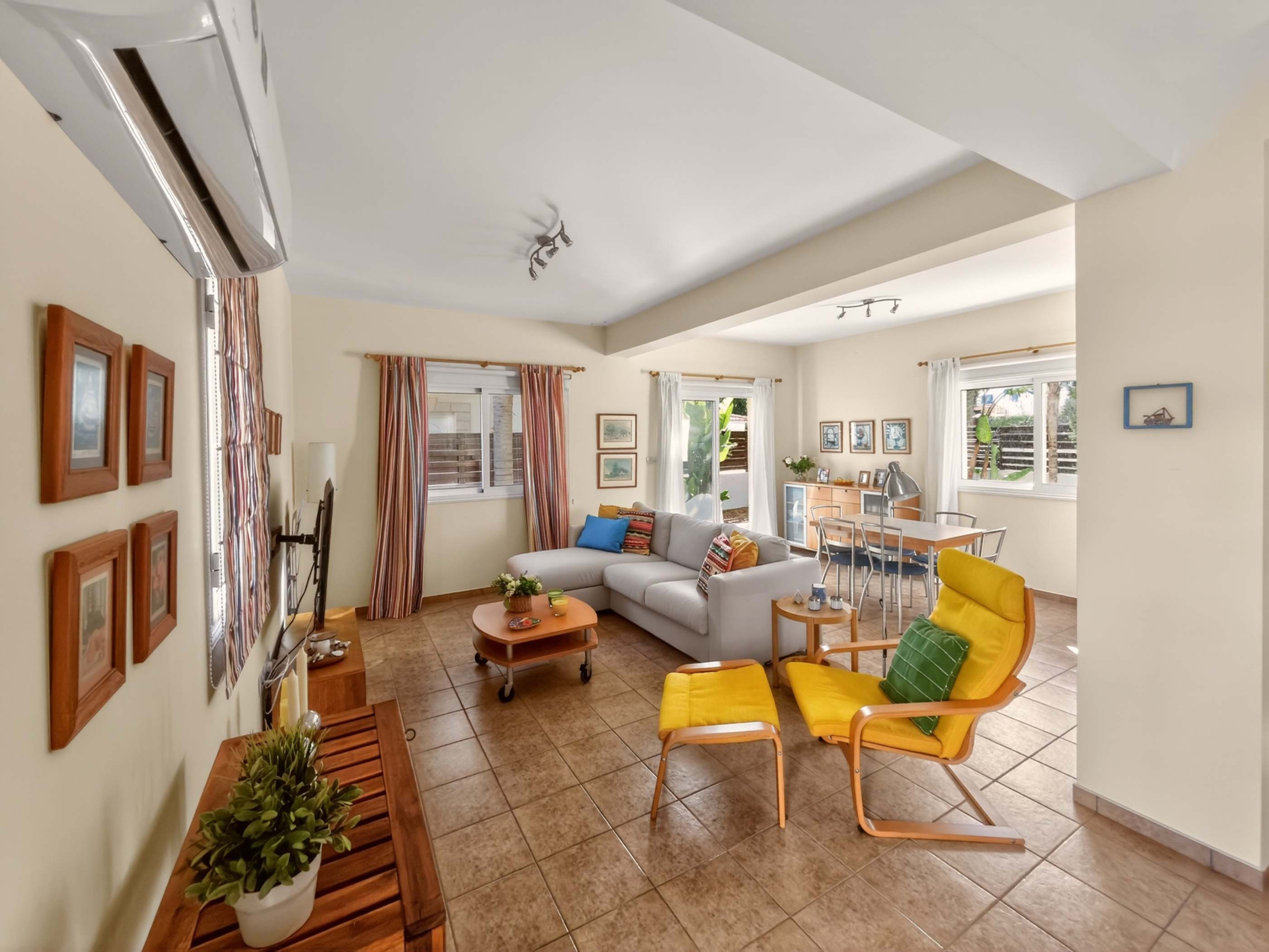 Bright, airy, and thoughtfully laid out, the living and dining area extends to a shaded terrace overlooking the private swimming pool. Outdoors, you will find a covered dining area with seating for six, along with a relaxing lounge space, perfect for slow breakfasts, long lunches, and peaceful evenings in the Cyprus sun.