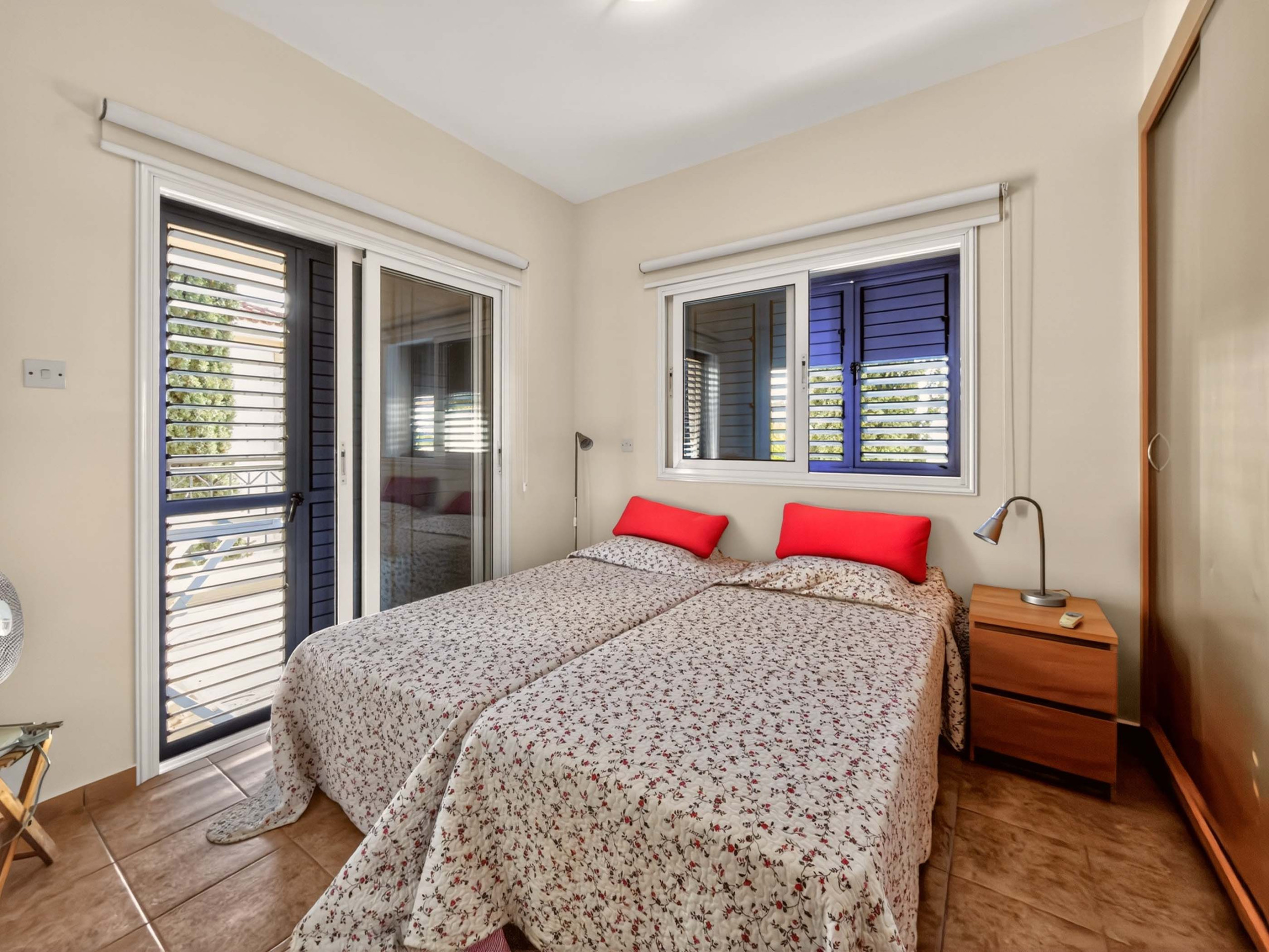 On the ground floor, there is a bedroom ideal for children or additional guests, furnished with a single bed and twin bunk beds, along with storage space and easy access to a guest toilet. Upstairs, the master bedroom features a double bed, an en suite shower room, and access to a covered veranda with pool views. A second upstairs bedroom offers two single beds and is served by a family shower room.