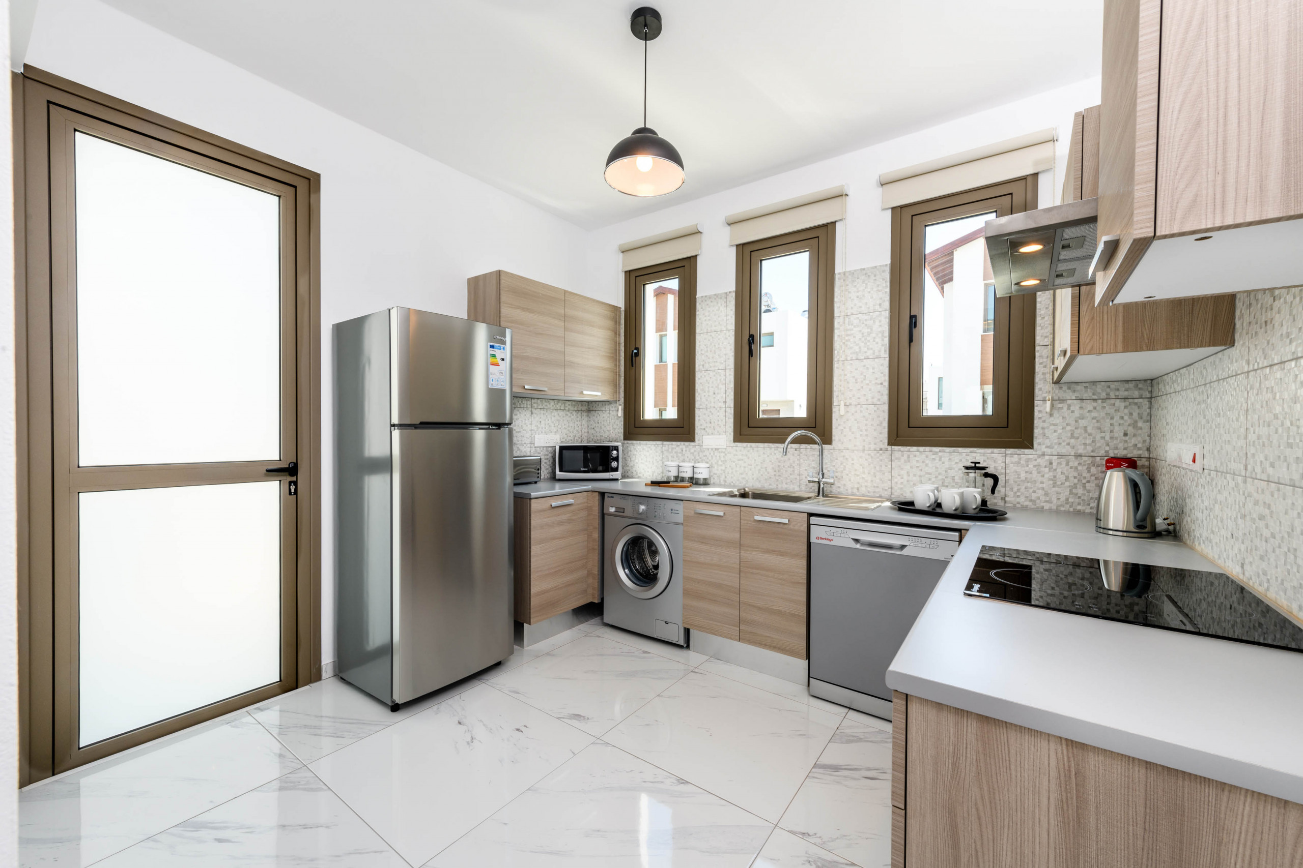 Жилая зона открытая, светлая и продуманно обставленная двумя удобными диванами, большим плоским телевизором с международными каналами, кондиционером и Wi-Fi по всей территории. Обеденная зона комфортно вмещает шесть гостей, а полностью оборудованная кухня предоставляет все необходимое для легких повседневных приготовлений пищи во время вашего пребывания.