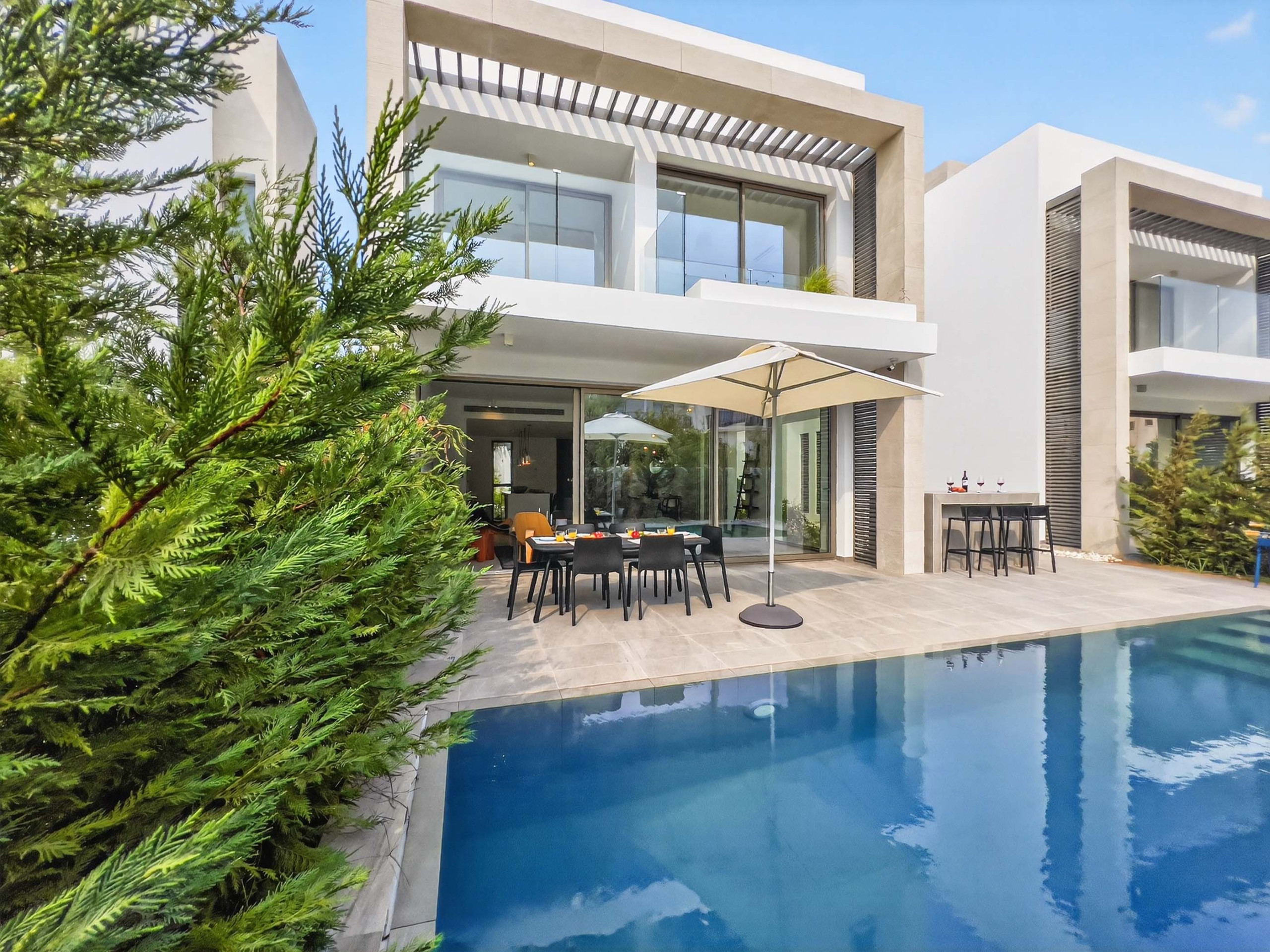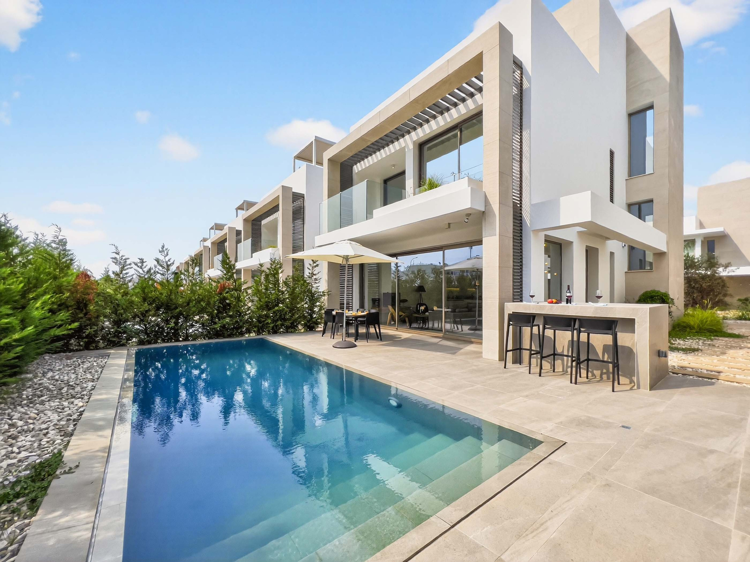 Den trerumslösningen inkluderar en privat pool, generös utomhusyta, solstolar, en grill och bekväma utemöbler. Det är en idealisk miljö för avslappnade dagar hemma.