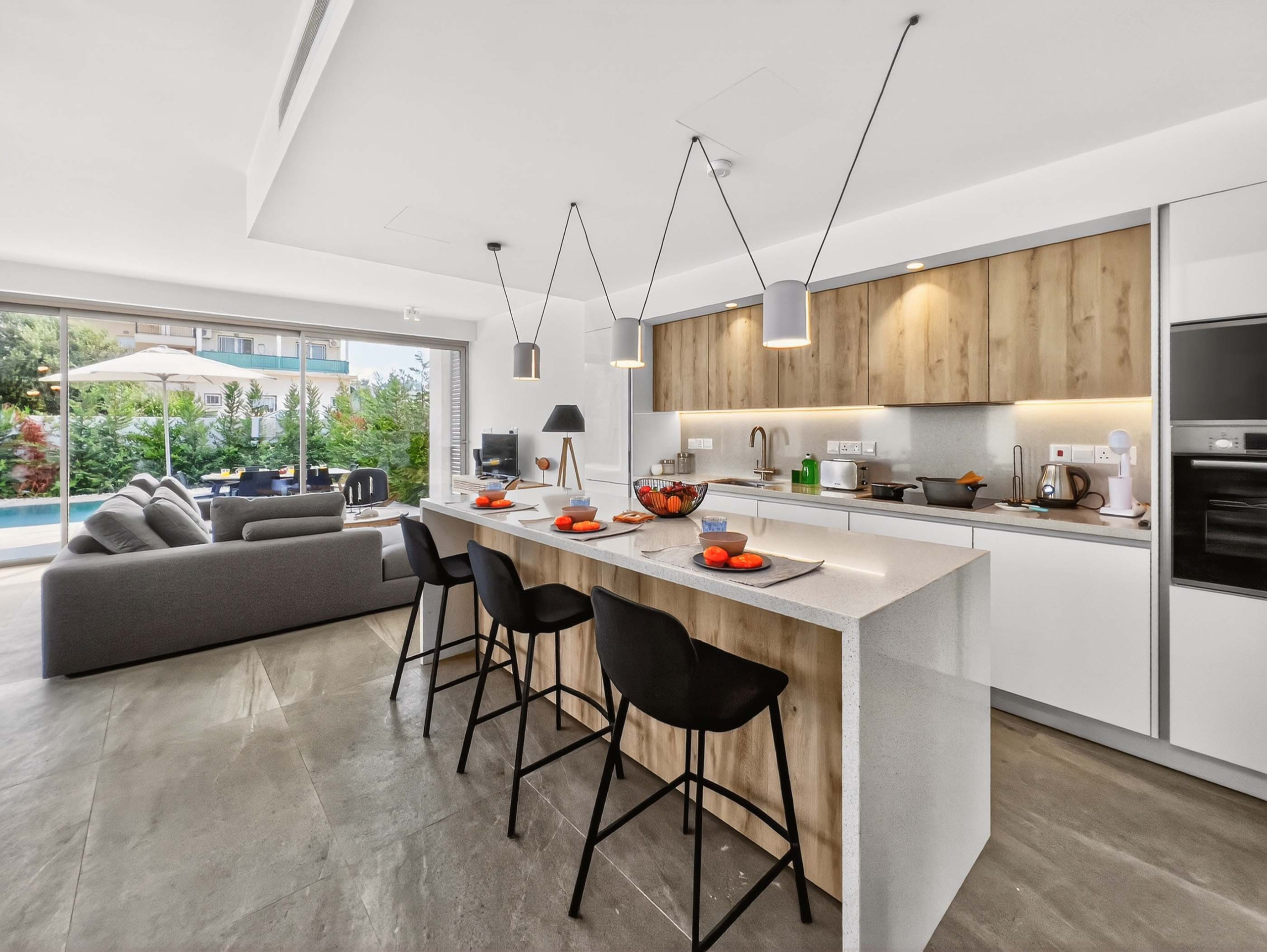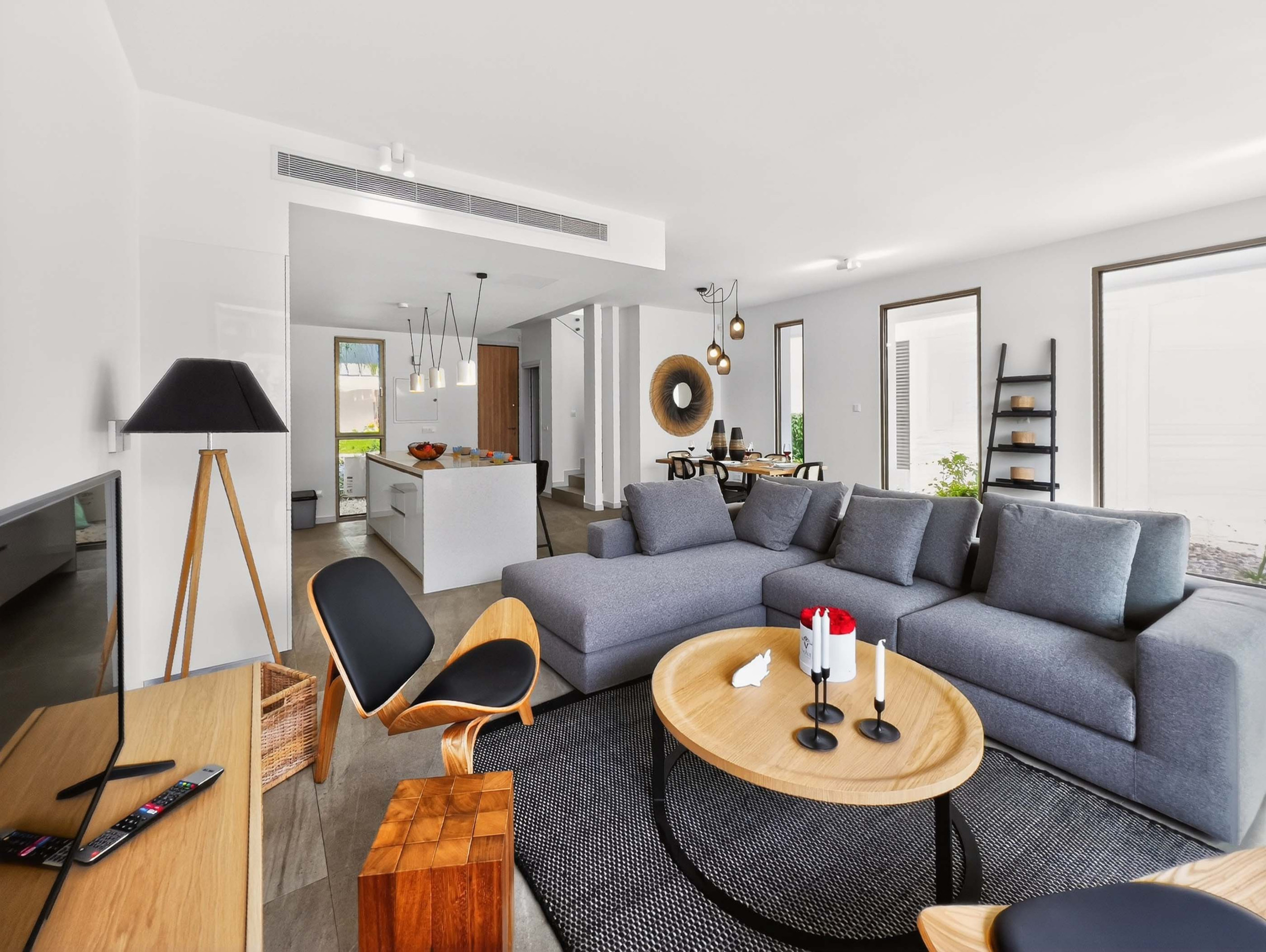 Inuti känns villan ljus och öppen. Den är fullt luftkonditionerad och har en rymlig vardags- och matplats, ett modernt kök med en frukostö, och alla väsentliga apparater för ett behagligt vistelse. Vardagsrummet inkluderar en hörnsoffa, en bred TV med många satellitkanaler och gratis WiFi. Stora altandörrar leder direkt till poolen. En gäst-WC finns också på bottenvåningen.