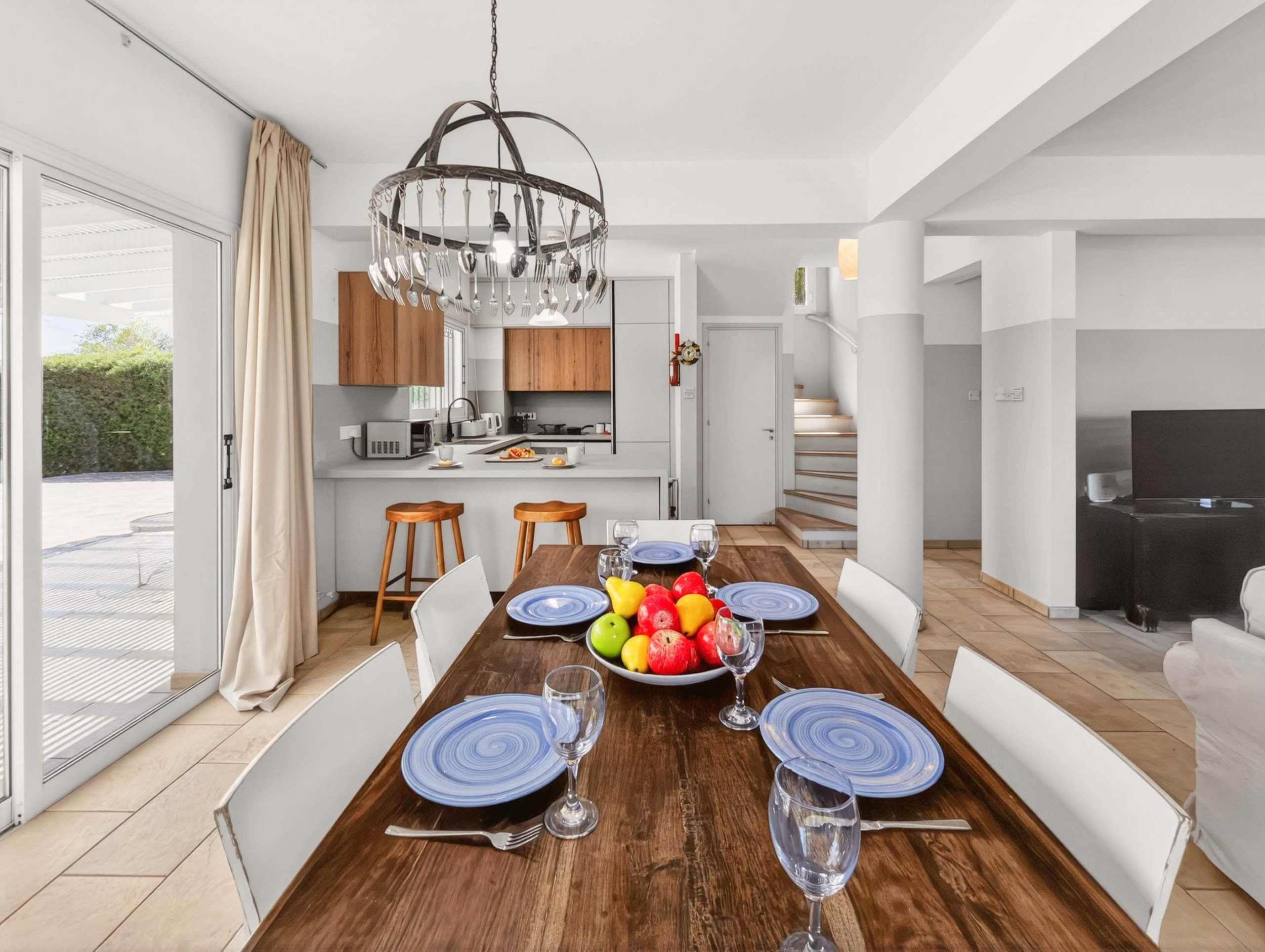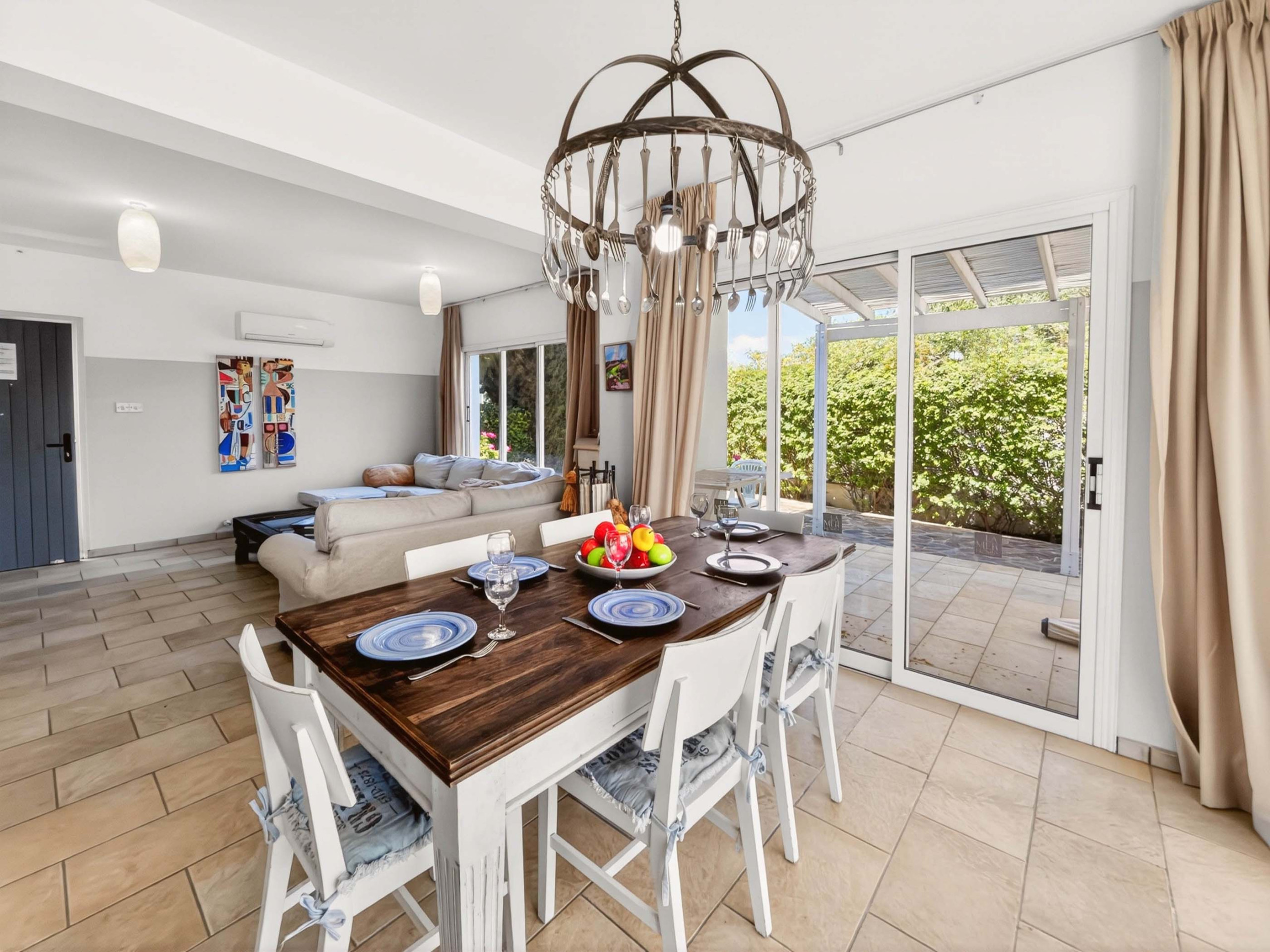 Inuti är villan utspridd över två våningar och har en ljus, luftig känsla under hela dagen. Det öppna vardagsrummet inkluderar bekväma soffor, en stor platt-TV med satellitkanaler och skjutdörrar som leder direkt till det utomhus utrymmet. Det fullt utrustat köket har gott om förvaring, träbänkar och allt som behövs för enkel självhushållning, medan matsalen bekvämt sitter sex gäster.