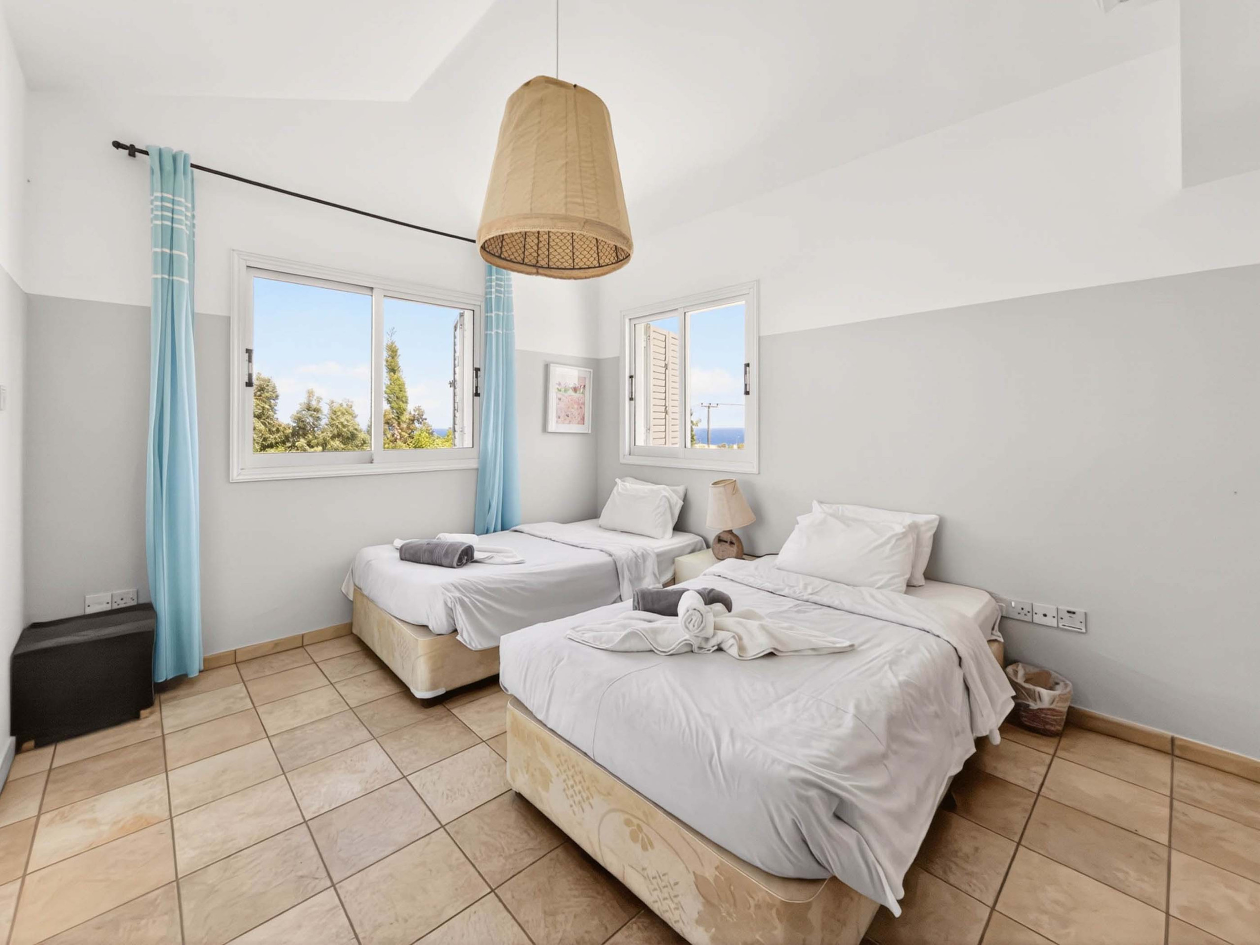 Sovsituationen är särskilt praktisk för familjer eller grupper. På bottenvåningen finns ett dubbelrum med tillgång till ett delat duschrum och WC. På övervåningen finns ett andra dubbelrum och ett tvillingrum med två enkelsängar. Båda sovrum på övervåningen har direkt tillgång till en stor veranda med vacker utsikt över havet, vilket skapar ett underbart utrymme för att njuta av en morgonkafé eller koppla av på kvällen. Alla sovrum är också utrustade med ett skrivbord, vilket gör villan särskilt bekväm för gäster som kanske vill arbeta, studera eller helt enkelt ha sitt eget lugna hörn under sitt vistelse.